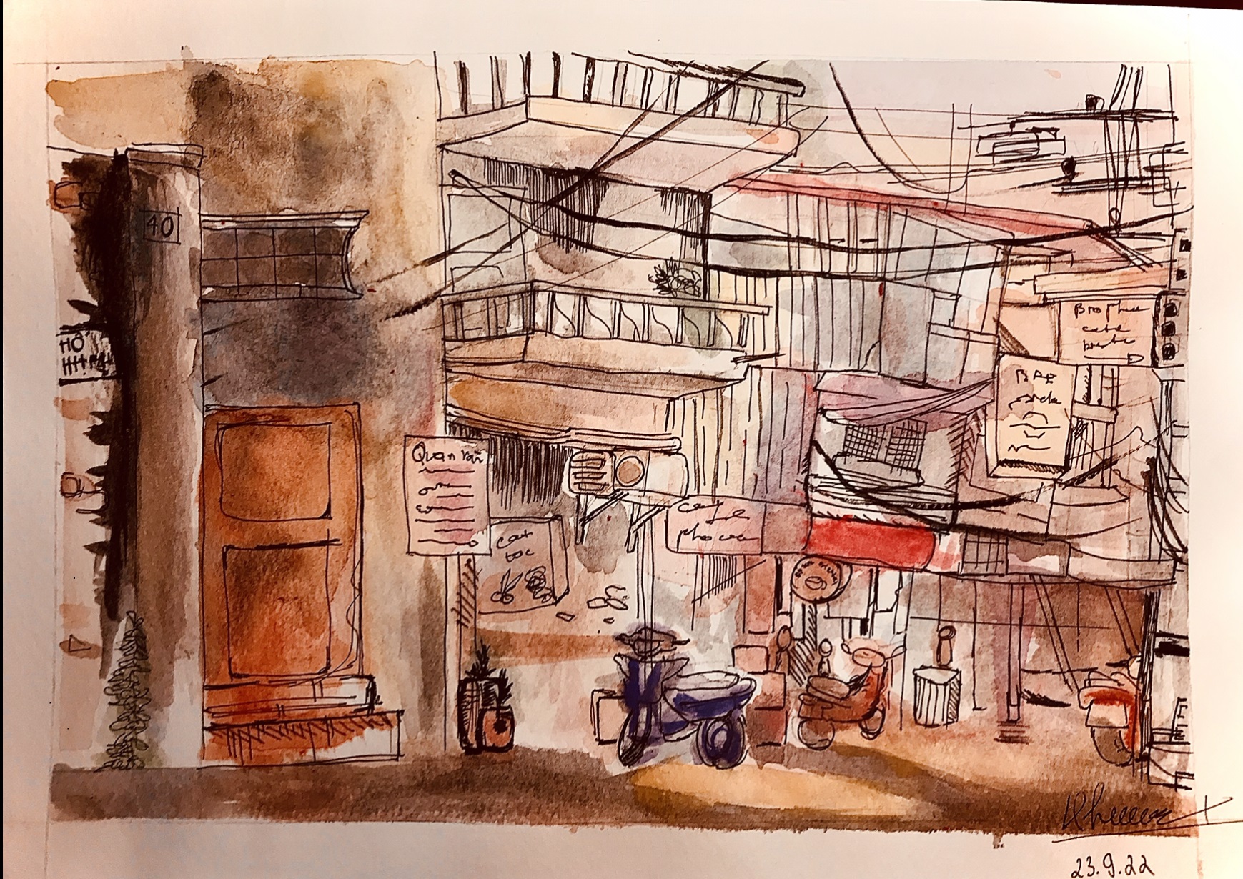 Khi vẽ, tôi thường hoài niệm về những gì đã qua… Hồi nhỏ, mẹ thường kể cho tôi về căn nhà tập thể mà mẹ đã từng sống, nó như đọng lại trong tôi, một cảm giác hoài niệm bất diệt, và tôi đã vẽ nên nó… trong lần đầu tiên sử dụng màu nước. Con đường ấy có thể bé nhỏ, ẩn mình sâu hoặc nó có thể ở chỗ nào trên mảnh đất hình chữ S này mà tôi chưa từng có cơ hội đặt chân đến, nhưng trong đó là bao kỉ niệm tuổi thơ của mẹ về một thời đã qua… Từ con Wave được coi là “ngầu” nhất xóm của các anh chị sinh viên, đến những quán cafe “tây tây” mới nổi lên như cồn thời đó, rời cột điện trăm tuổi theo bao thế hệ trải qua các biến đổi của đất nước. Tôi muốn tham lam mà ôm hất chúng vào bức tranh này như những người lớn muốn ích kỉ, chỉ muốn tuổi thơ giờ chỉ còn là ký ức ở mãi trong mình…