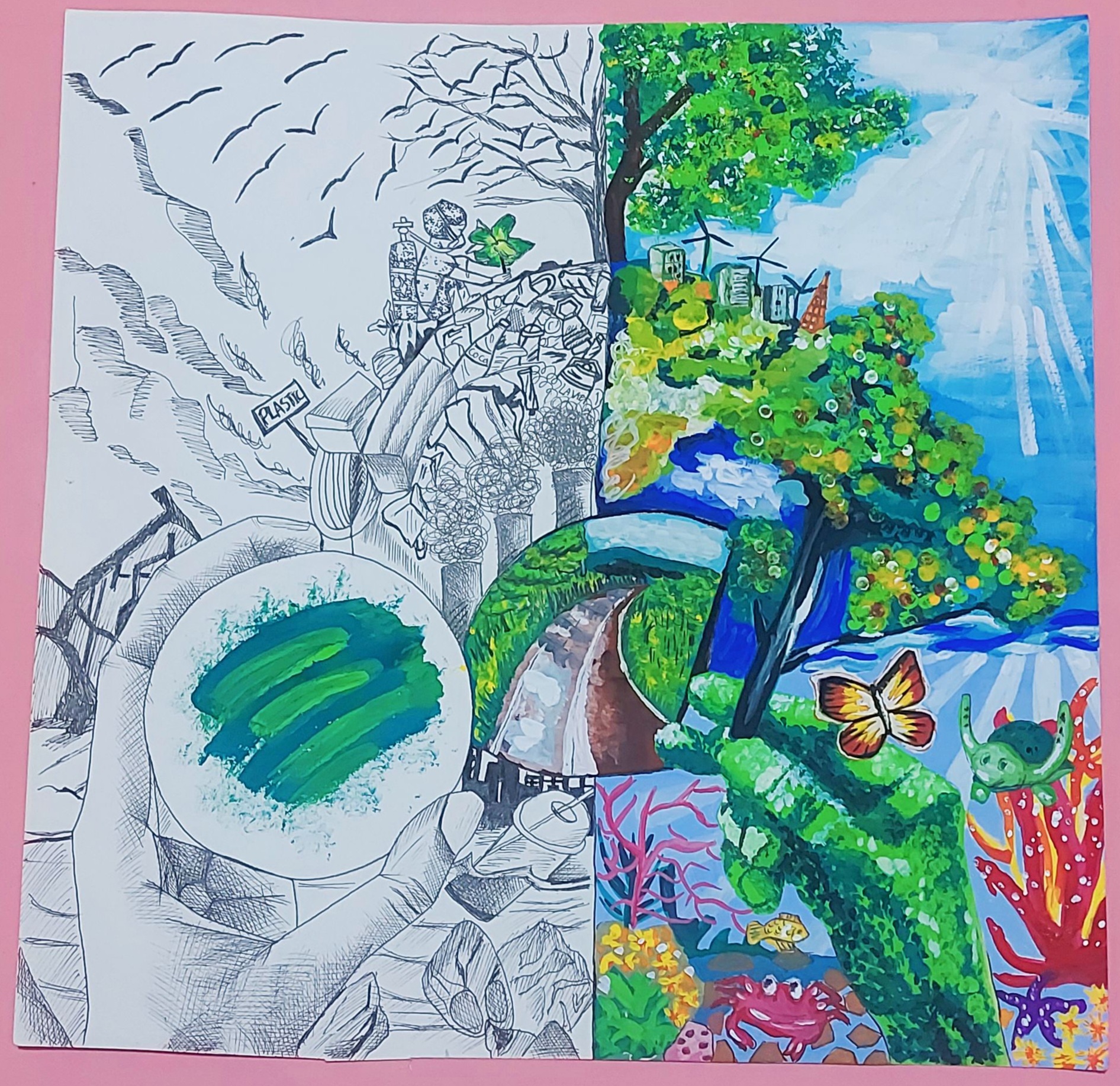 Nếu chúng ta vẫn tiếp tục làm những chuyện như hiện nay thì vấn nạn của trái đất sẽ lâm vào nguy kịch. Trong bức tranh, bãi rác thải nhựa bao phủ kín trái đất dẫn đến nguy cơ không còn sự sống. Đứa bé trong tranh là hiện thân thế hệ tương lai, đang tự cứu lấy chính mình bằng cách chung tay đánh bại ô nhiễm nhựa.