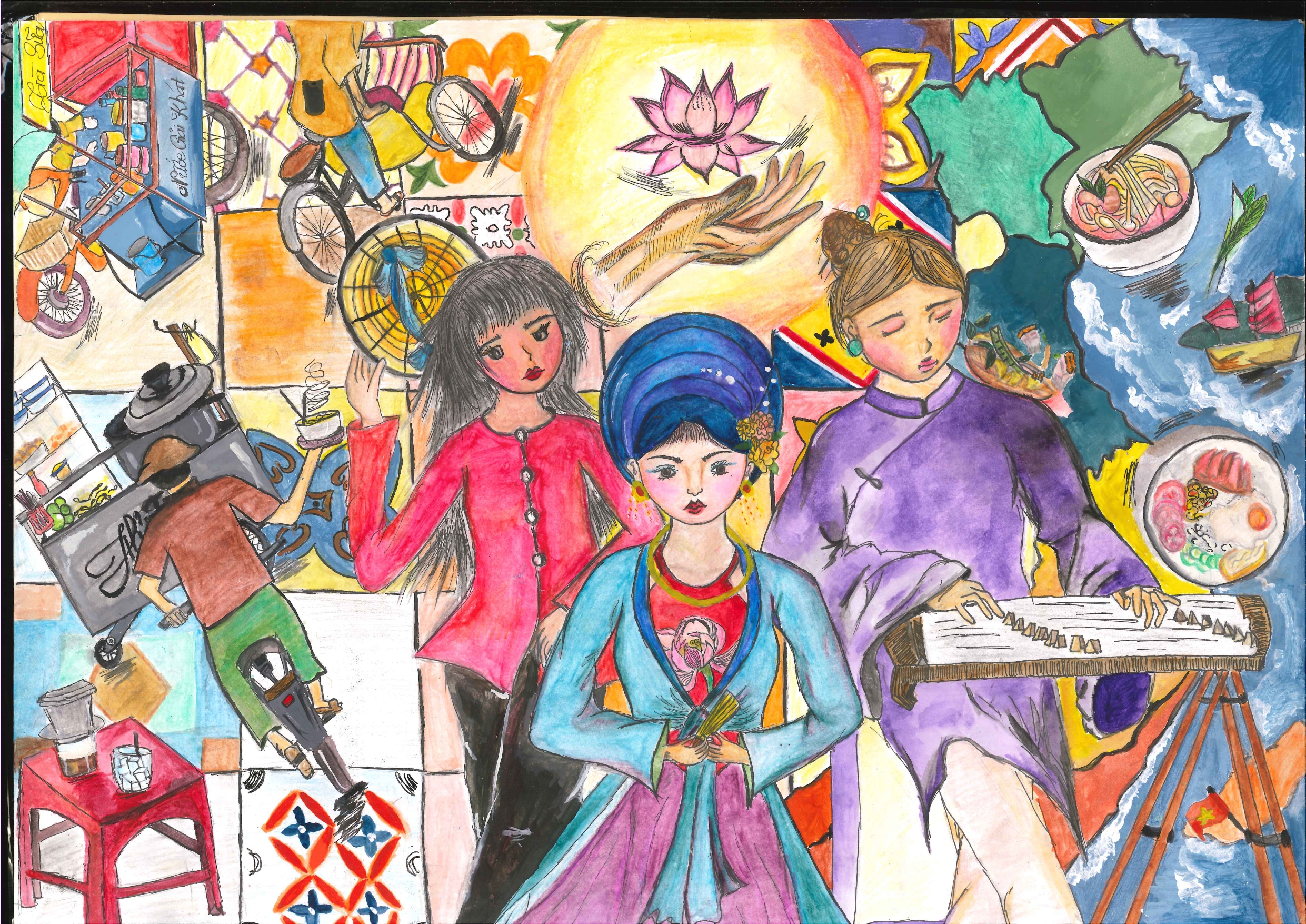 Nước ta vốn là một đất nước với bề dày lịch sử truyền thống và lâu đời. Bản “ Sắc” Việt Nam qua tác phẩm được thể hiện rất rõ qua những loại trang phục truyền thống độc đáo, đa dạng và nhiều màu sắc ở các vùng miền, dân tộc khác nhau. Nếu ở miền Bắc có áo tứ thân – một trang phục được thiết kế dựa theo sự tượng trưng cho những đức tính cao đẹp của người con gái Việt Nam (với 4 tà áo đại diện cho tứ thân phụ mẫu, đó là bố mẹ mình và bố mẹ chồng; vạt cụt nằm ở trong hai vạt áo là thể hiện cho sự ôm ấp của bố mẹ cho con gái mình; 5 nút áo được đính trên áo cân xứng thể hiện cho 5 đức tính tốt đẹp của người là nhân, nghĩa, lễ, trí, tín; 2 vạt áo đằng trước được buộc lại thể hiện cho tình cảm vợ chồng luôn bên nhau, bền chặt, gắn bó). Thì ở miền Nam, áo bà ba được xem là trang phục đặc trưng với thiết kế đơn giản và chất liệu được làm từ các loại vải mềm, mỏng, nhẹ, mát như lụa,… Còn nhắc tới miền Trung, ta sẽ nhớ ngay tới hình ảnh áo dài xứ Huế với màu tím mộng mơ. “ Hương” Việt được biểu trưng với hương sen thơm ngát hòa cùng với “ Vị “ của những món ăn đặc sắc làm nên tên tuổi của ẩm thực Việt trong nền ẩm thực quốc tế.