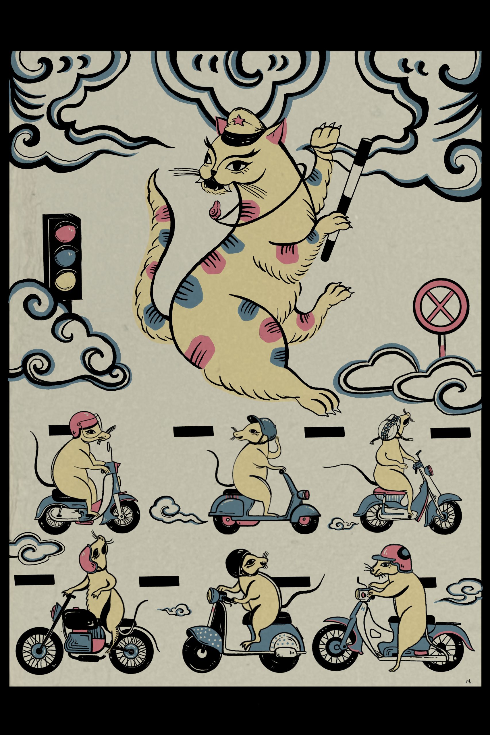 Sinh ra tại thủ đô Hà Nội, trải nghiệm không chỉ những mặt tốt mà còn là những mặt chưa tốt, em muốn mang đến một góc nhìn mới về đô thị thông qua ngôn ngữ tranh thờ và tranh dân gian đông hồ. Hà Nội với cảnh tắc đường đặc trưng, hương vị khói bụi và sắc màu của dòng tranh dân gian là cái mà em muốn thể hiện thông qua tác phẩm.