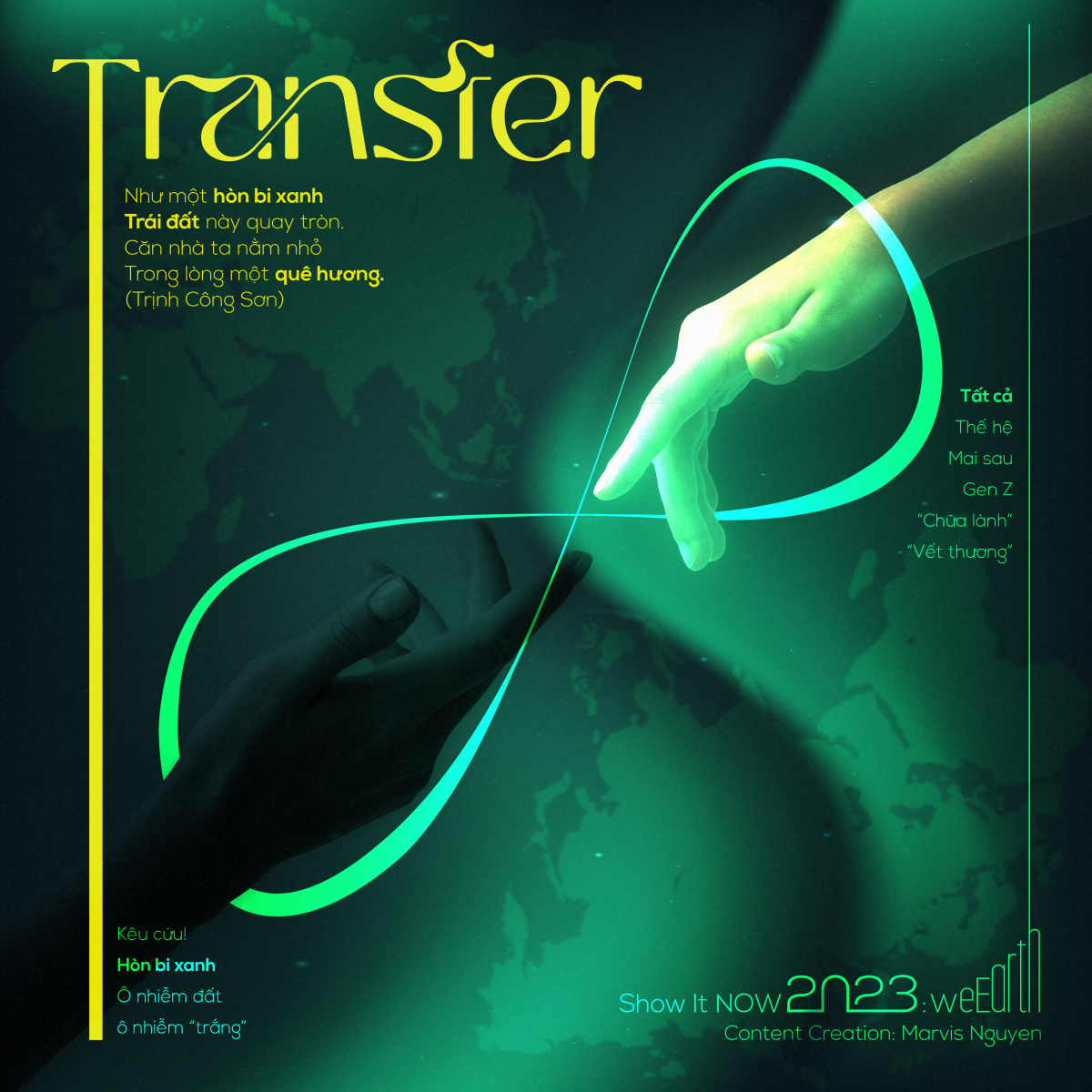 – Tác phẩm sử dụng tone xanh lá mang ý nghĩa của sự phát triển, thiên nhiên. Tác phẩm mang thông điệp truyền tải tư tưởng nối tiếp ước mơ, từ thế hệ cũ sang thế hệ mới để có thể sửa đổi cải thiện, khắc phục những lỗi lầm hoặc làm tốt hơn những gì mà thế hệ đi trước vẫn chưa hoàn thành được. Thiết kế mang hình ảnh ẩn dụ: