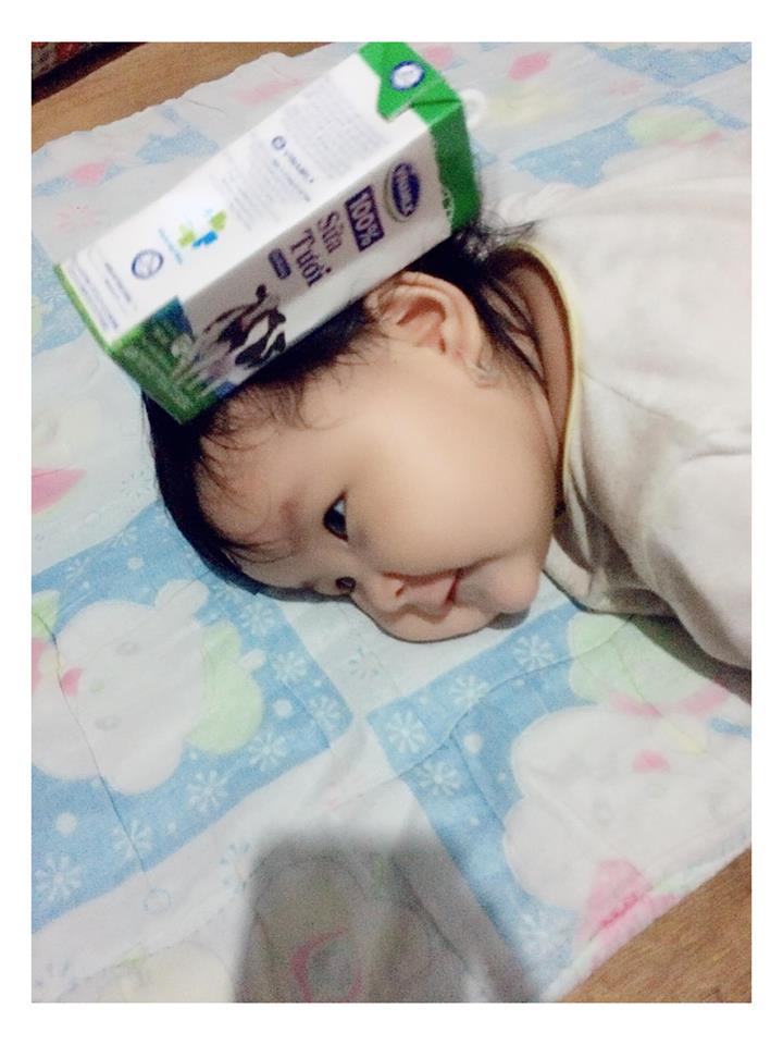 Đứa em gái cách mình 17 tuổi. Ẻm đang thích thú vì mình đặt hộp sữa rỗng lên đầu ẻm. Đơn giản là quá đỗi cute mà.