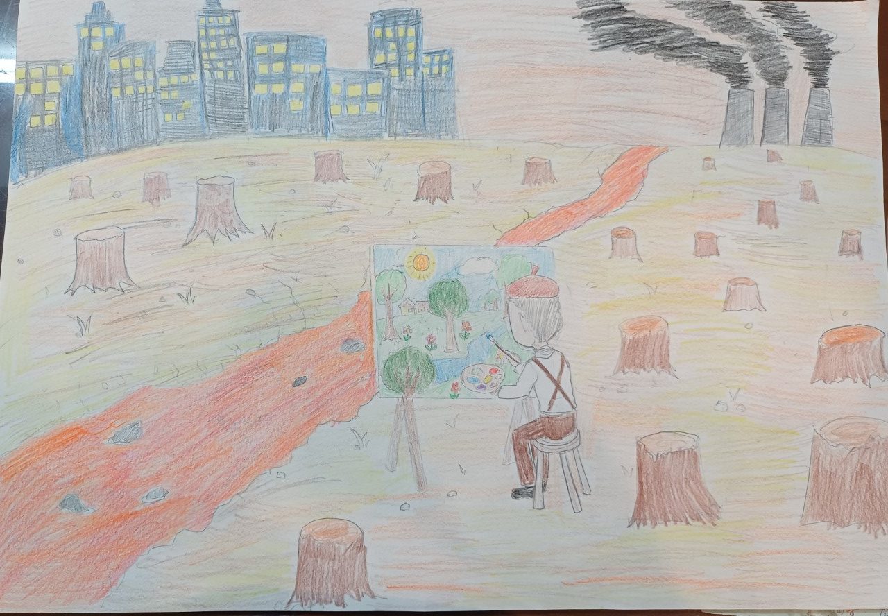 Bức tranh mô tả sự khác nhau của thiên nhiên giữa quá khứ và thực tại qua bức tranh của người họa sĩ già. Phong cảnh trong bức tranh của người họa sĩ hiện lên tràn đầy sức sống với những tán cây, thảm cỏ xanh mướt với dòng sông xanh biếc. Mặc dù bức tranh có đẹp thế nào cũng chỉ là hồi ức của người hoạ sĩ già khi phải đối mặt với thực tại. Khung cảnh bên ngoài bức tranh hoàn toàn trái ngược: thảm cỏ xanh đã biến mất, cây đã bị chặt đi, nước sông nhuốm đầy màu đất cát, xa xa là những tòa nhà cao tầng và làn khói từ nhà máy che phủ bầu trời. Đó là lời cảnh tỉnh cho những người đang hưởng thụ sự tiện nghi của lối sống hiện đại mà không quan tâm lối sống đó đang hủy hoại thiên nhiên thế nào.