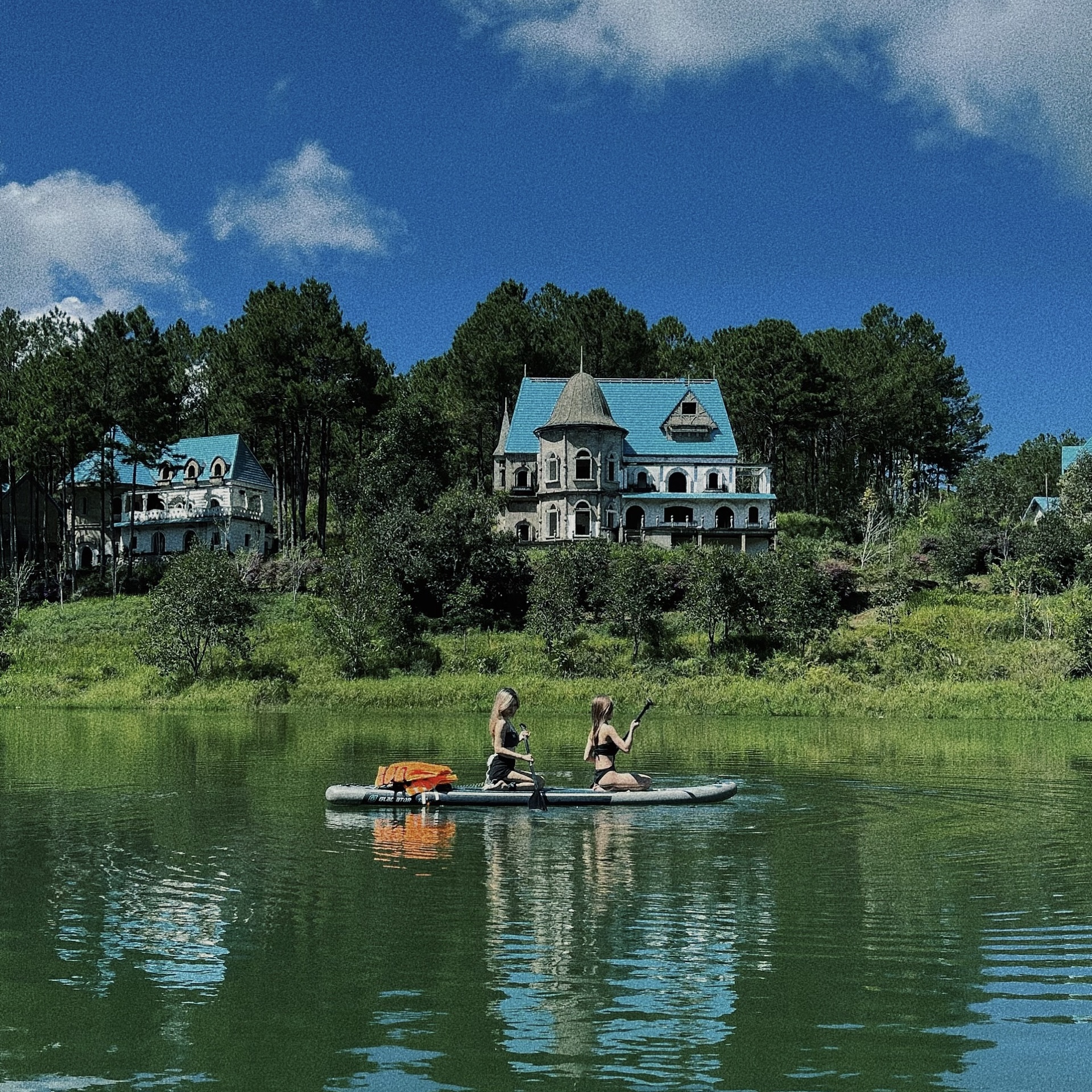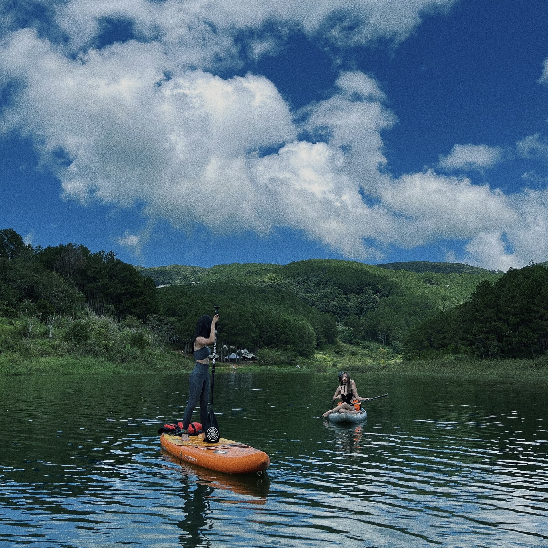 Đây là một bức ảnh về phong cảnh buổi sáng ở Hồ Tuyền Lâm với khung cảnh bầu trời mây trắng trong xanh, ánh nắng chan hòa, với các hoạt động thể thao vô cùng thú vị. Trong bức ảnh, mình thể hiện hình ảnh 2 người đang chèo Sup để ngắm cảnh vật xung quanh Hồ Tuyền Lâm, với góc nhìn chân thật và rõ nhất.