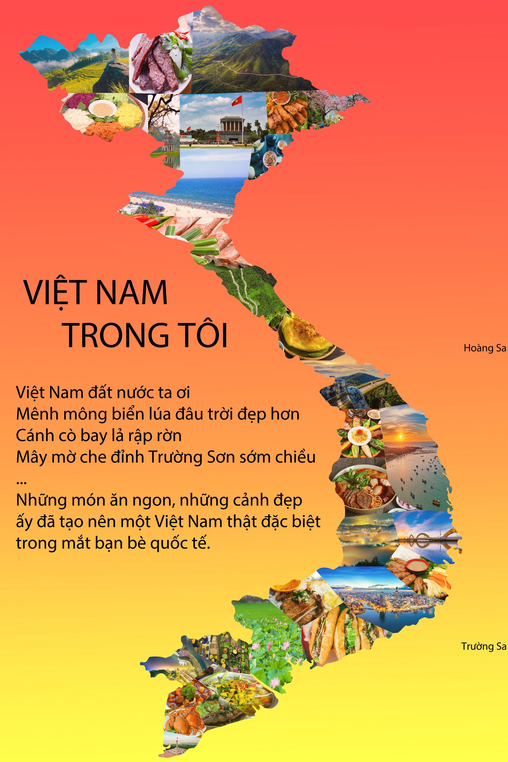 Dựa trên những hình ảnh đẹp về cảnh sắc, các món ăn ngon của Việt Nam tất cả tạo thành hình dạng đất nước Việt Nam hình chữ S xinh đẹp.