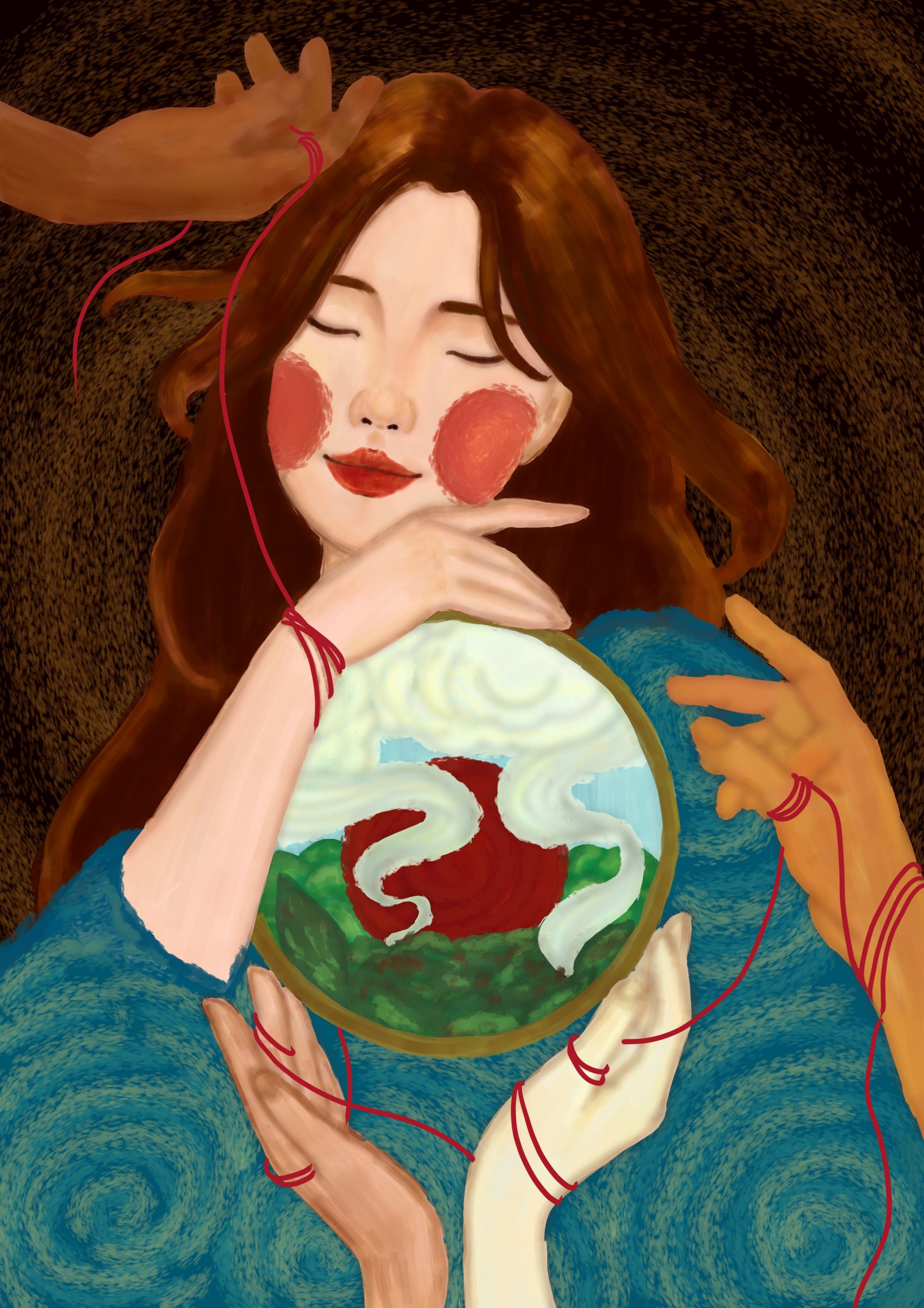 Chủ đề về Con Người và Trái Đất đã không còn quá xa lạ đối với mọi người. Tác phẩm của mình được lấy ý tưởng từ hình ảnh người Mẹ. Mẹ ở đây không phải người mang nặng đẻ đau chúng ta nhưng lại là người duy trì sự sống cho chúng ta, đó là “Mẹ Trái Đất”. Là những đứa con của Mẹ Trái Đất, được gắn trên tay mình sợi “Tơ Đỏ” thể hiện sự gắn kết mật thiết trường tồn qua hàng vạn năm tuy vô hình, mong manh nhưng chưa bao giờ đứt. Bất kì ai trong chúng ta, dù bạn có sinh sống ở đâu, hay khoác lên mình màu da nào đi nữa thì hãy cùng chung tay bảo vệ, gìn giữ sự Xinh Đẹp của Mẹ Trái Đất nhé!