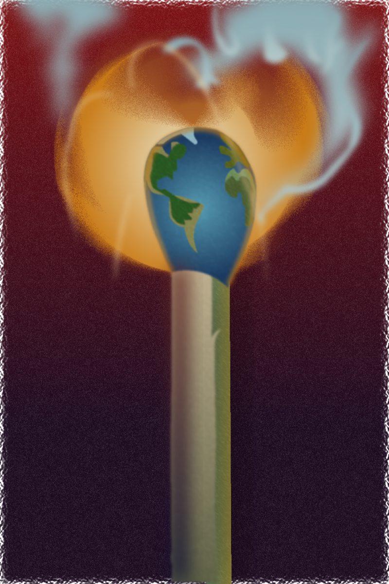 Do những hành động chặt phá rừng, liên tục xả thải khí gây ô nhiễm môi trường của con người, Trái đất đang trở nên nóng hơn từng ngày do ảnh hưởng hiệu ứng nhà kính. Bài vẽ muốn thể hiện điều đó qua hình ảnh ẩn dụ ví Trái đất làm đầu que diêm bốc cháy.