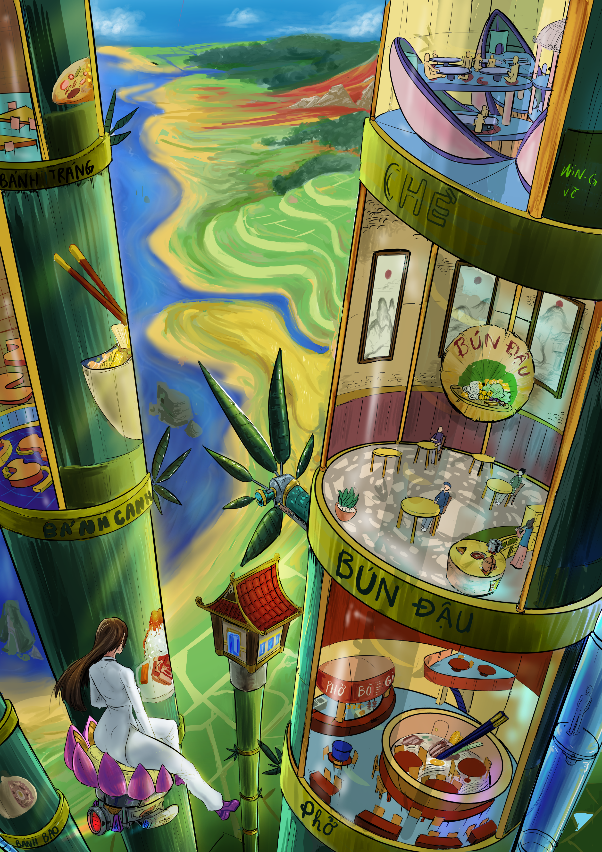 Đây là công trình mang tính khoa học viễn tưởng. Mỗi đốt tre sẽ là một nhà hàng phục vụ một món đặc sản đặc trưng của Việt Nam. Công nghệ nano đặc biệt khiến bất kì phần tường nào cũng có thể mở thành cửa cho khách. Phần tường ngoài sẽ quay liên tục xung quanh để đổi view ngắm nhìn đất nước với góc nhìn đa dạng. Phần cảnh nền mình có vẽ ruộng bậc thang ruộng lúa đất đỏ  bazan kênh ngòi… những cảnh vật rất Việt Nam.