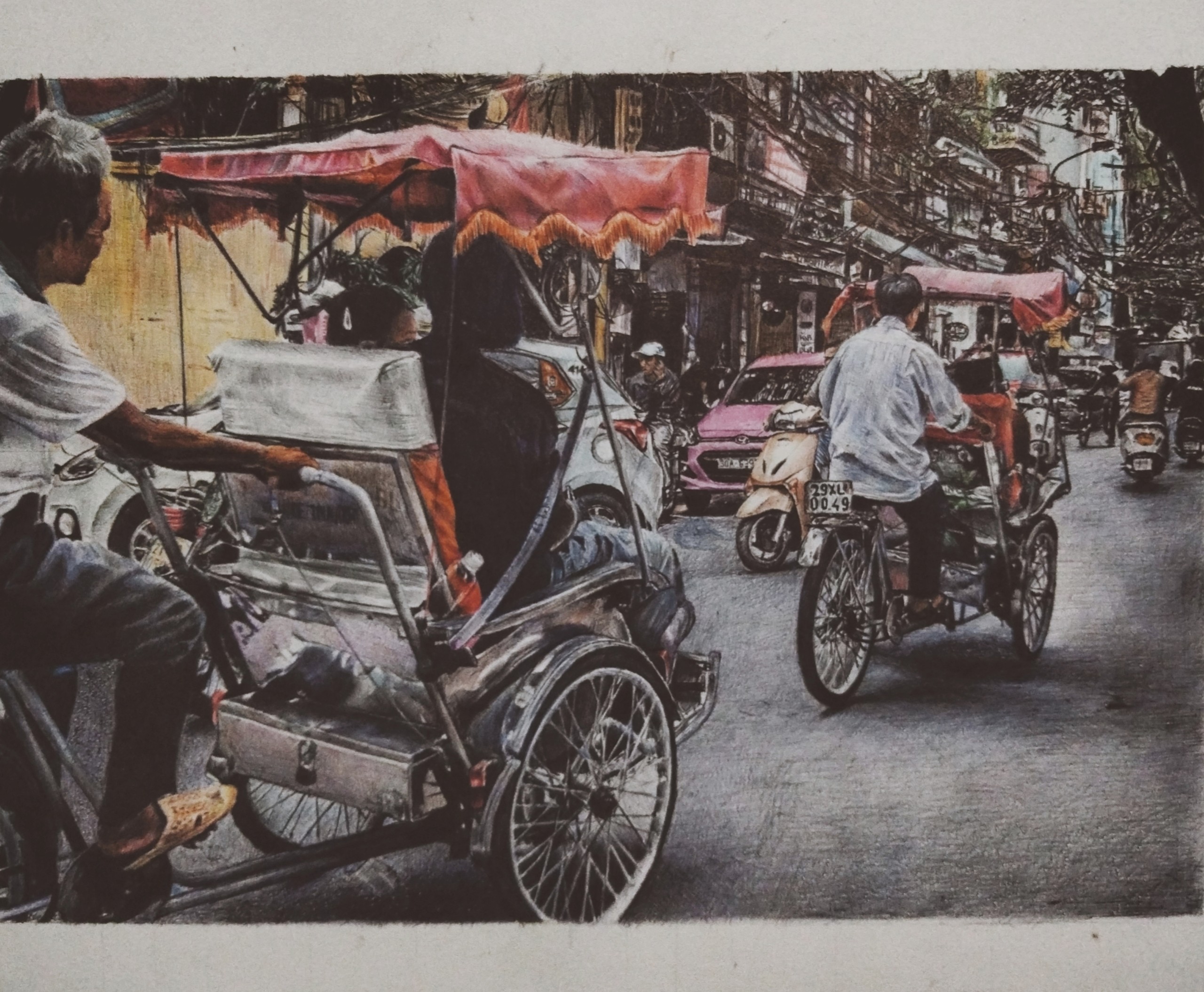 Phương tiện luôn phát triển để đáp ứng nhu cầu của con người. Nền công nghiệp của con người càng phát triển thì càng tỷ lệ nghịch với sự tinh khiết của bầu không khí, Nước và trái đất. Con người khi nhìn thấy hậu quả mới loay hoay để tìm lại những hồi ức, những quá khứ mà họ nghĩ rằng tươi đẹp khi thực tại vẫn đang bị hủy hoại dần dần. Bức tranh này đã được thực hiện với cảm xúc liên tục, thứ mà người nghệ sĩ nào cũng mong muốn, hình ảnh mang một cái chất quen thuộc giữa đường phố tấp nập xe qua lại giữa dòng người tìm lối mưu sinh.