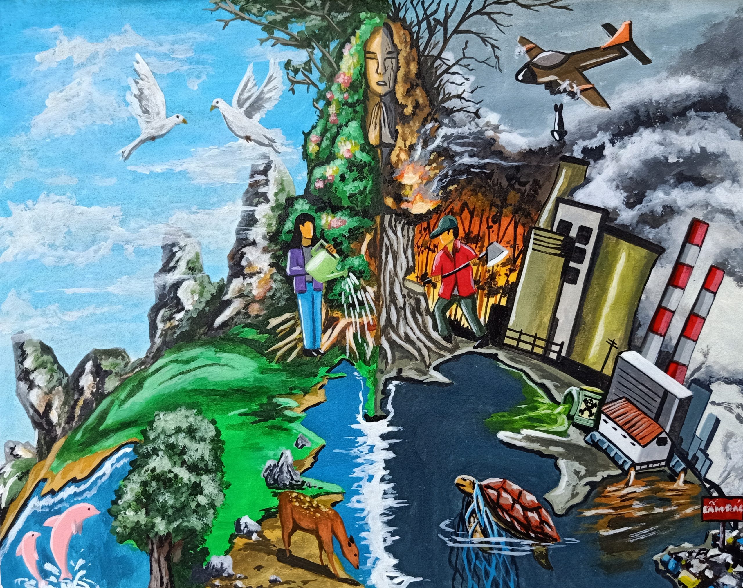 Hiện nay, vấn nạn ô nhiễm môi trường luôn là đề tài gây nhức nhối với chúng ta trong những năm qua, khi số lượng rác thải và khí độc thải ra mỗi ngày đang tăng lên với con số báo động. Tình trạng chặt phá, cháy rừng vẫn diễn ra hàng năm. Hàng ngàn sinh vật biển đã phải sống trong một môi trường đầy rác thải nhựa do con người tạo ra. Chính những điều này đã gây tổn hại đến Mẹ thiên nhiên – Trái Đất, dẫn đến biến đổi khí hậu nặng nề. Từ nguồn không khí trong lành mà Mẹ Thiên nhiên ban tặng, ngày nay chúng ta phải sống trong môi trường đầy khói bụi. Để giảm thiểu được tình trạng trên, chúng ta nên xây dựng các biện pháp, ý thức bảo vệ môi trường, đặt nền móng tái tạo lại một môi trường Xanh – Sạch – Đẹp. Điều đó đã được em thể hiện trong bức tranh của mình, nhằm phản ánh thực trạng con người tàn phá môi trường đã ảnh hưởng đến Trái Đất như thế nào và sự thay đổi tích cực của Trái Đất nếu chúng ta biết bảo vệ môi trường. Em hi vọng bức tranh của mình sẽ lan tỏa thông điệp tích cực đến cho mọi người, để chúng ta cùng chung tay bảo vệ môi trường tốt đẹp hơn.