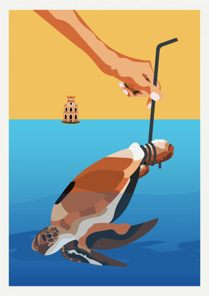 Trước khi cụ Rùa ở Hồ Gươm mất 2016, người dân đã thấy một số hình ảnh cụ bị thương ở móng và mai. Cũng thời gian đó, công nhân thu gom rác trên mặt hồ và người ta thấy rất nhiều rác thải như vỏ bánh kẹo, vỏ hộp sữa, túi ni lông và XÁC CÁ CHẾT. Hiện nay, Hồ Gươm là địa điểm du lịch nổi tiếng trong và ngoài nước. Mong rằng thông qua bức vẽ này, mọi người trước khi vứt rác xuống hồ hãy nghĩ về cụ Rùa, đừng làm cụ bị thương. Đây là cũng đang bảo vệ các sinh vật khác đang sống trong hồ.