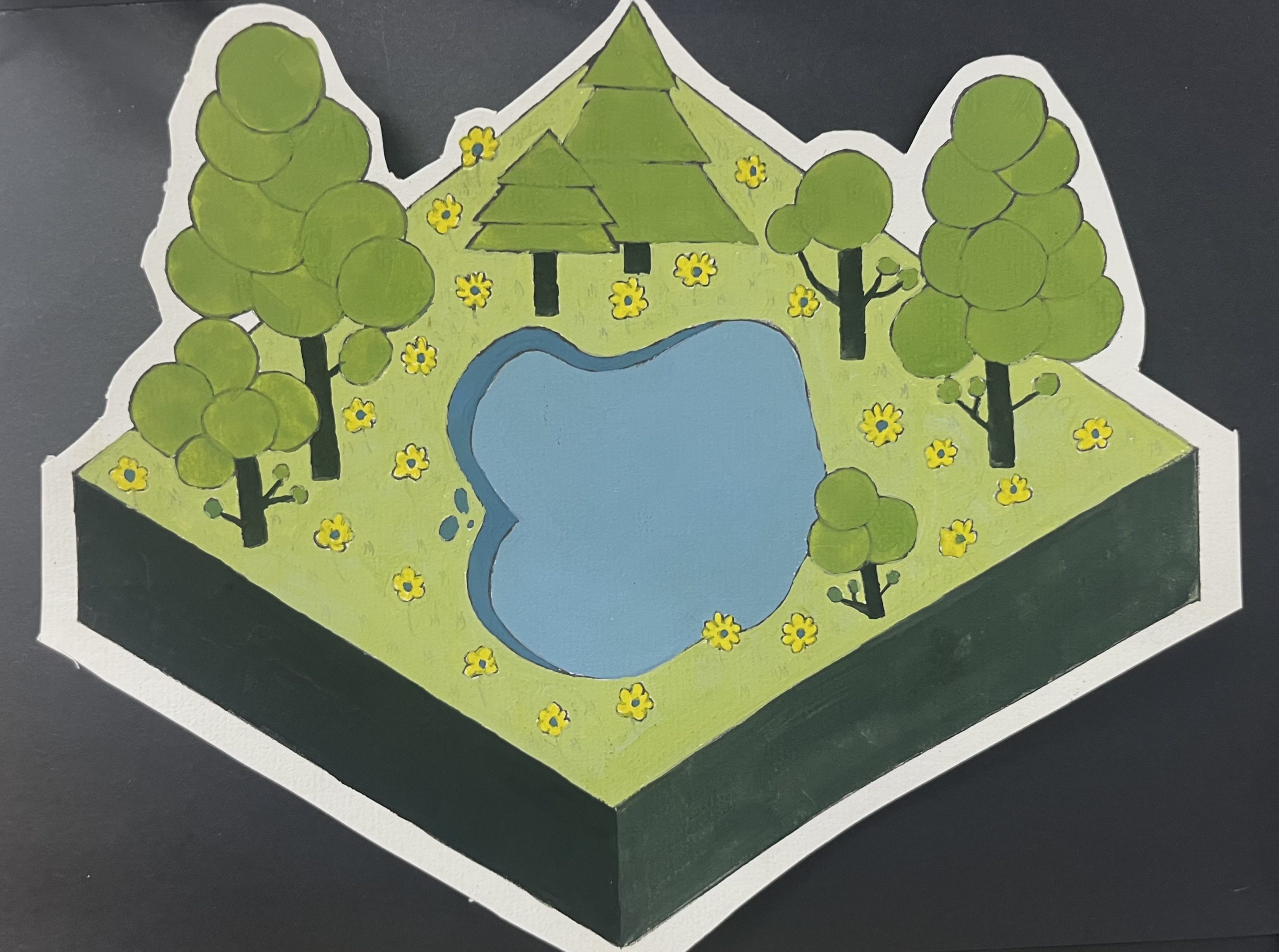 Sản phẩm của em có ý tưởng từ khung cảnh của công viên. Là sự kết hợp giữa những bóng cây xanh mát và bể hồ cá, điểm thêm là những bông hoa nở rộ. Tác phẩm em vẽ theo thể loại isometric kết hợp với tone màu tương đồng là màu xanh để nhìn cho bức tranh thiên nhiên hài hoà hơn và tươi mát hơn.