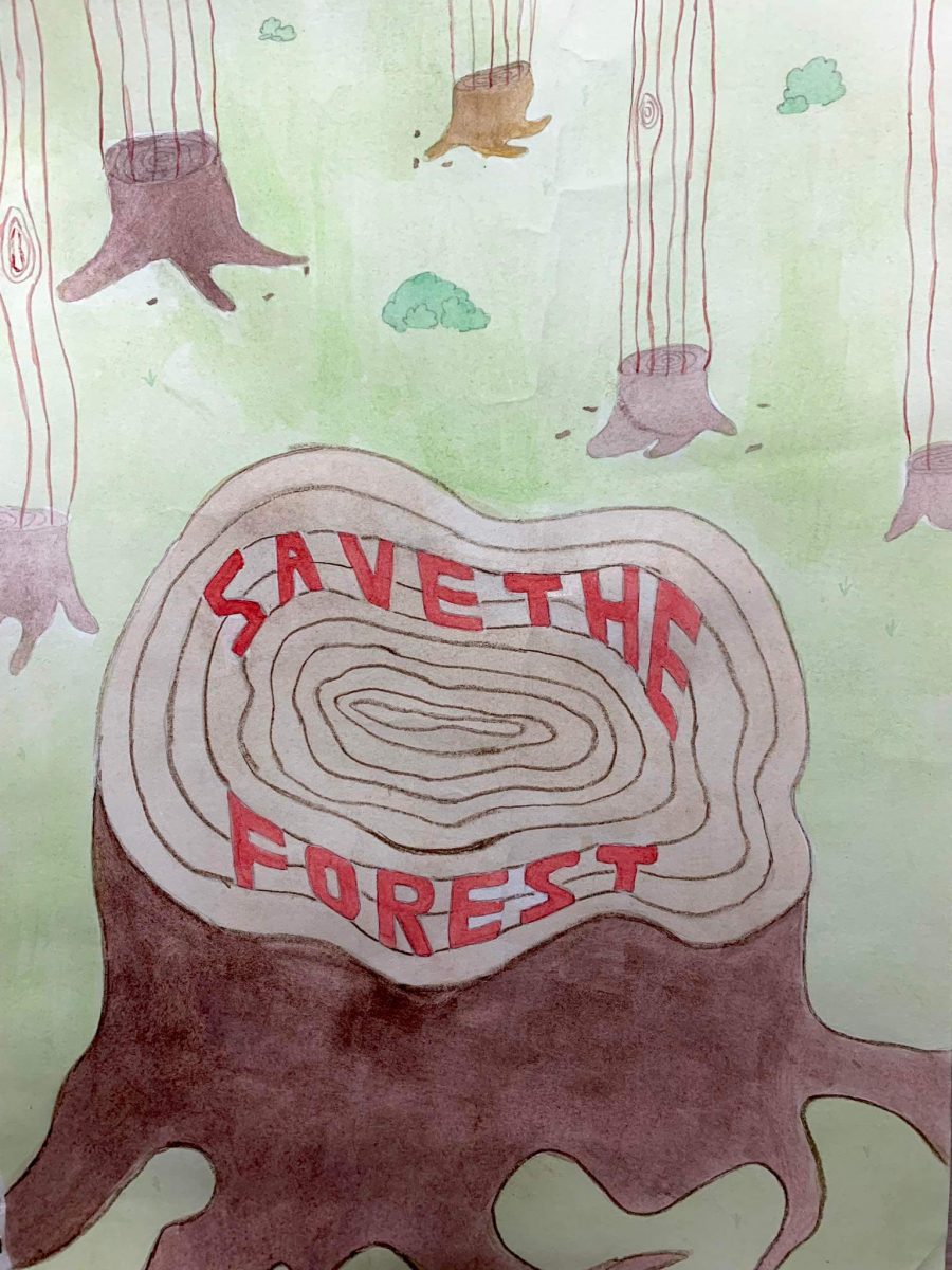 Bức tranh mô tả một khu rừng đã bị chặt phá.Nạn chặt phá rừng là một vấn đề nghiêm trọng hiện nay.Việc chặt phá rừng gây ra sự suy thoái của hệ sinh thái tự nhiên.Rừng không chỉ là nhà của nhiều loài sinh vật mà còn cung cấp nguồn tài nguyên quý giá cho con người.Sự chặt phá rừng không chỉ ảnh hưởng đến môi trường mà còn gây ra hiệu ứng nhà kính và tăng sự biến đổi khí hậu toàn cầu.