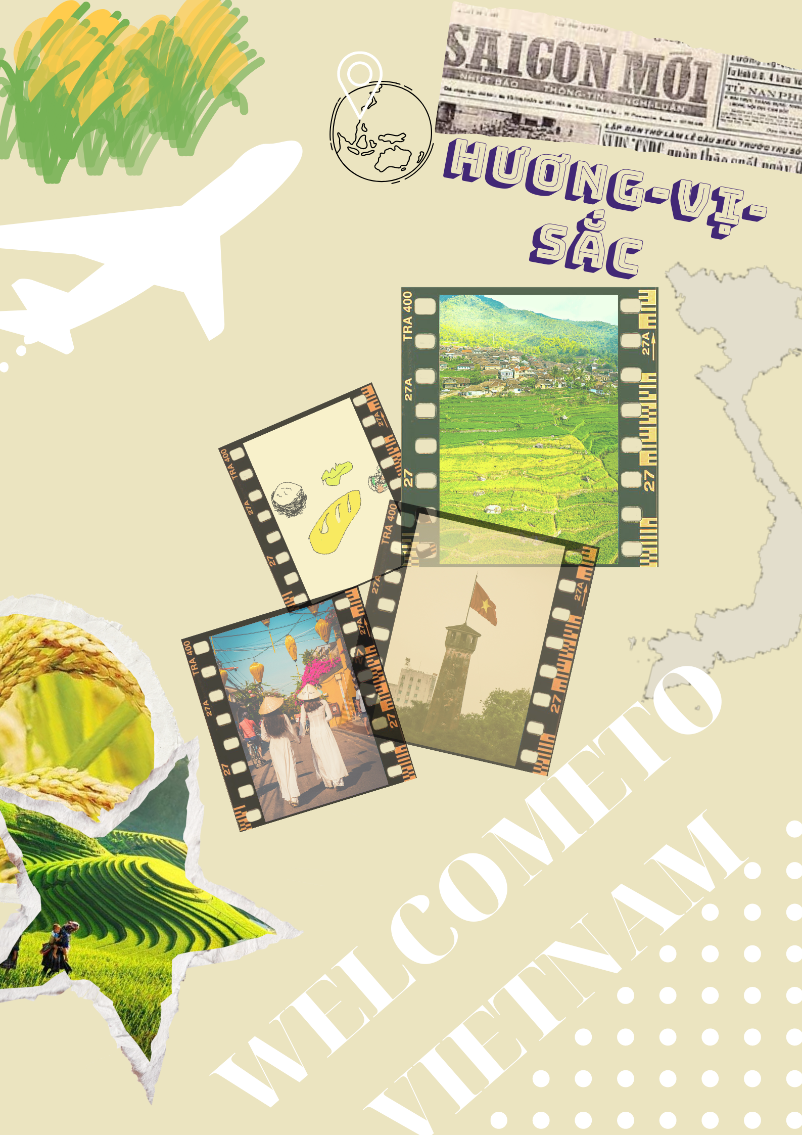 Bài dự thi trên của em được lấy cảm hứng từ những gam màu đặc trưng của quê hương. Thông qua tấm poster này, em hi vọng mọi người trên thế giới sẽ biết đến Việt Nam nhiều hơn không chỉ là một nước với hơn 95 triệu dân mà còn là một nước với sự đa dạng trong văn hoá, phong tục, tập quán, ẩm thực, du lịch… Việt Nam – dải đất hình chữ S thân quen với những nền văn hoá đậm đà bản sắc dân tộc. Đến với nơi đây, ta cảm nhận những sắc màu tươi rói – sắc Việt. Từ những cánh đồng mênh mông, bao la cùng với hương thơm ngan ngát của mùa lúa chín vàng ươm đầy nắng. Những thửa ruộng bậc thang trải dài một màu xanh bất tận. Con người chan hoà vào thiên nhiên, điểm tô cho một bức tranh tươi đẹp đất Việt.