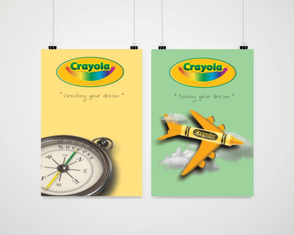 Poster bút màu Crayola: Bộ poster được lấy cảm hứng từ nhãn hàng bút màu Crayola. Bộ poster được thực hiện dựa trên 2 màu cơ bản: xanh lá và vàng cam, hai màu chính đặc trưng của nhãn hiệu. Lấy ý tưởng thực hiện dựa trên việc “biến ước mơ thành hiện thực”, mong muốn mọi đứa trẻ trên thế giới đều “vẽ nên ước mơ” của mình bằng cách sửa dụng bút màu Crayola.