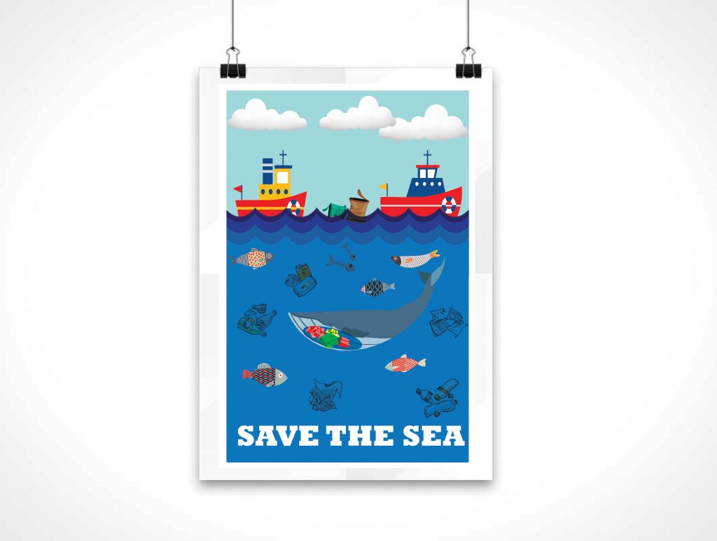 Poster tuyên truyền bảo vệ môi trường biển. Project được thực hiện bằng phong cách Illustration với màu xanh dương của biển là màu chủ đạo.