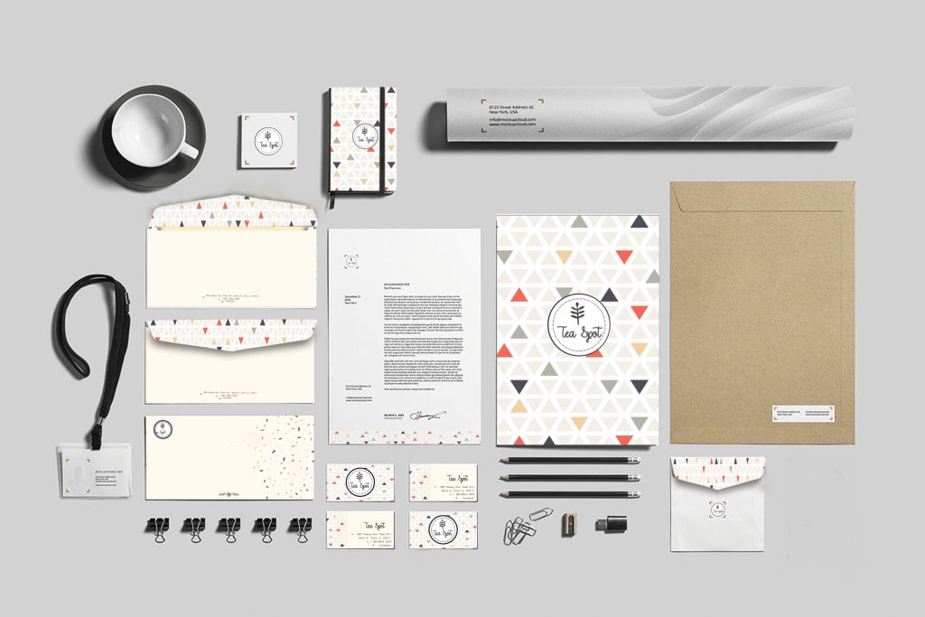 Bộ nhận diện văn phòng của thương hiệu trà Tea Spot, một thương hiệu với đặc trưng là sử dụng túi trà hình tam giác.