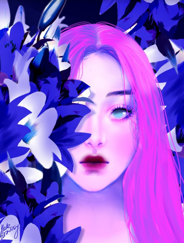 Đây là về hoa ly, một loài hoa tượng trưng cho sự tinh khôi của người thiếu nữ. Đồng thời, loài hoa này cũng mang nghĩa tái sinh, một khởi đầu mới. Bức tranh này có ý nghĩa cực kỳ lớn với mình. Mình đã vẽ một người quen đã đi xa. Trong bucket list của cô ấy có một việc cô ấy muốn làm là nhờ mình vẽ cô ấy, nhưng mình chưa làm được gì cho cô ấy, cô ấy đã không còn đây nữa rồi.