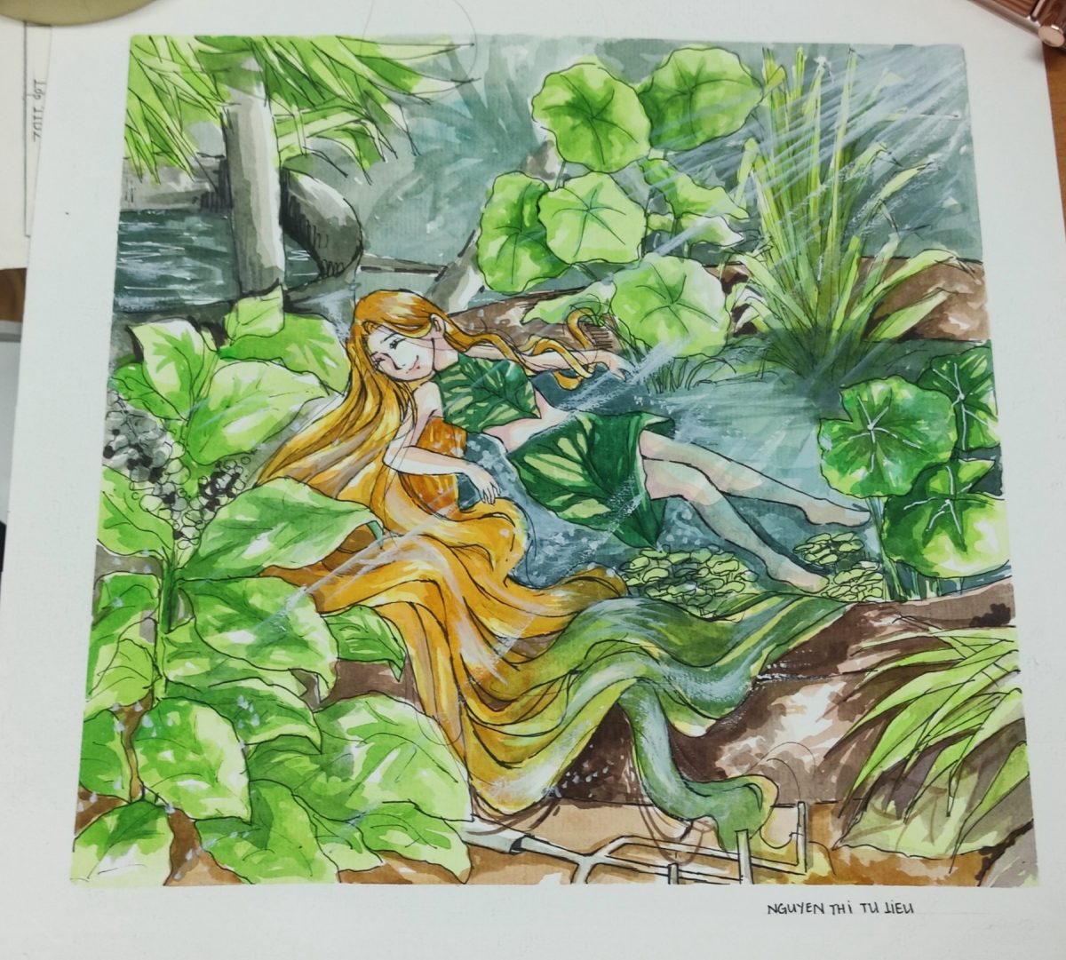 Ý tưởng của em có lẽ sẽ không lớn lao như nói lên thực trạng ô nhiễm hiện nay vì đó là điều ai cũng biết rằng trái đất đang kêu cứu. Vì thế tranh ý tưởng của em hướng tới những điều giản đơn rằng thiên nhiên và con người là bạn, tôi yêu thiên nhiên và thiên nhiên môi trường yêu chúng ta. Khi sống hoà mình vào thiên nhiên xanh mát tươi đẹp ấy rồi chúng ta sẽ thấy, môi trường thiên nhiên thật sự cần chúng ta chăm bón bảo vệ. Bằng hình ảnh chiếc cào đất trồng cây ở dưới mép tranh, em muốn cho mọi người thấy là khi chúng ta chăm sóc cây thì sẽ mang đến oxi cho môi trường trái đất. Mọi thứ em vẽ là sự mát mẻ những tia nắng chiếu xuống như một sự khởi đầu mới với hi vọng trái đất chúng ta thật tươi đẹp như bức tranh ấy.
