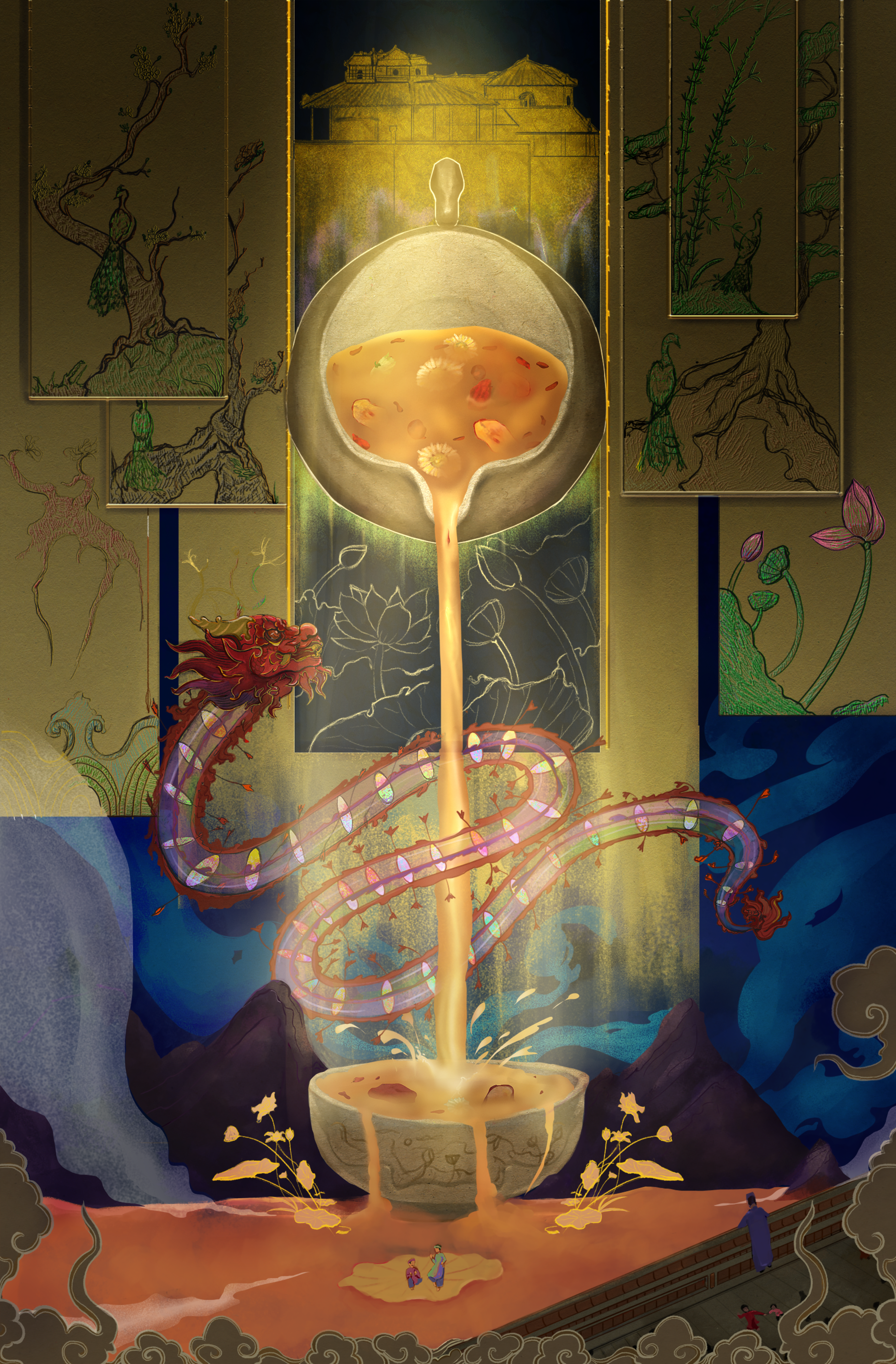 Với chủ đề năm nay là về hương vị sắc của Việt Nam, ban đầu mình cũng khá là mông lung với chủ đề này, vì Việt Nam có rất nhiều thứ hay ho và mình thấy khá là bối rối trong lúc lên ý tưởng cho bài vẽ, nhưng trong lúc đang suy nghĩ nên làm gì thì mình đột nhiên nhớ đến loại trà cung đình Huế mà bố mình hay pha uống lúc đợt dịch, nên là mình quyết định chọn trà cung đình Huế để thể hiện cái hương-vị-sắc cho bài dự thi này, dựa vào cảm giác khi hớp ngụm trà vào trong miệng thì mình như được bước vào một không gian khác cùng với âm điệu khi uốn lượn mình của con diều rồng và tiếng rót trà, tất cả hòa quyện lại tạo nên âm hưởng của trà cung đình Huế.