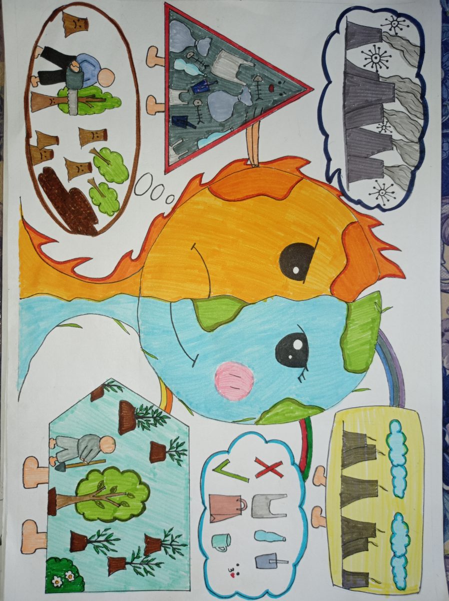 Tác phẩm của mình phản ánh những hành động của con ngoài đã và đang làm cho trái đất trở nên hư hại. Đó là những thói quen sống vứt rác bừa bãi gây ô nhiễm nguồn nước khiến cho các loài sinh vật dưới nước chết hàng loạt. Đời sống con người gắn liền với bao bì nilon và tiêu xài một cách đầy hao phí. Bên cạnh đó việc các nhà máy công suất lớn cứ hàng ngày xả ra môi trường không biết bao nhiêu là khí thải độc hại dẫn đến các bệnh về hô hấp cho con người. Mọi người chỉ nghĩ việc lợi trước mắt mà sẵn sàng chặt phá rừng lấy đất xây dựng hoặc bán các loại gỗ quý hiếm. Đó chỉ là một trong số rất nhiều việc làm của con người mà không phải khó để bắt gặp. Con người chúng ta ngày càng đối xử với trái đất một cách thờ ơ, nhẫn tâm để chúng nổi giận thì chúng ta mới quay lại dỗ dành. Bằng chứng là hiện nay nhiệt độ trái đất đang nóng lên, thiên tai bão lũ xảy ra ở nhiều nơi. Chính chúng ta đang làm hại chúng ta. Hãy dừng lại ngay những việc làm thiếu trách nhiệm ấy để trái đất ngày một tươi đẹp hơn mọi người nhé!
