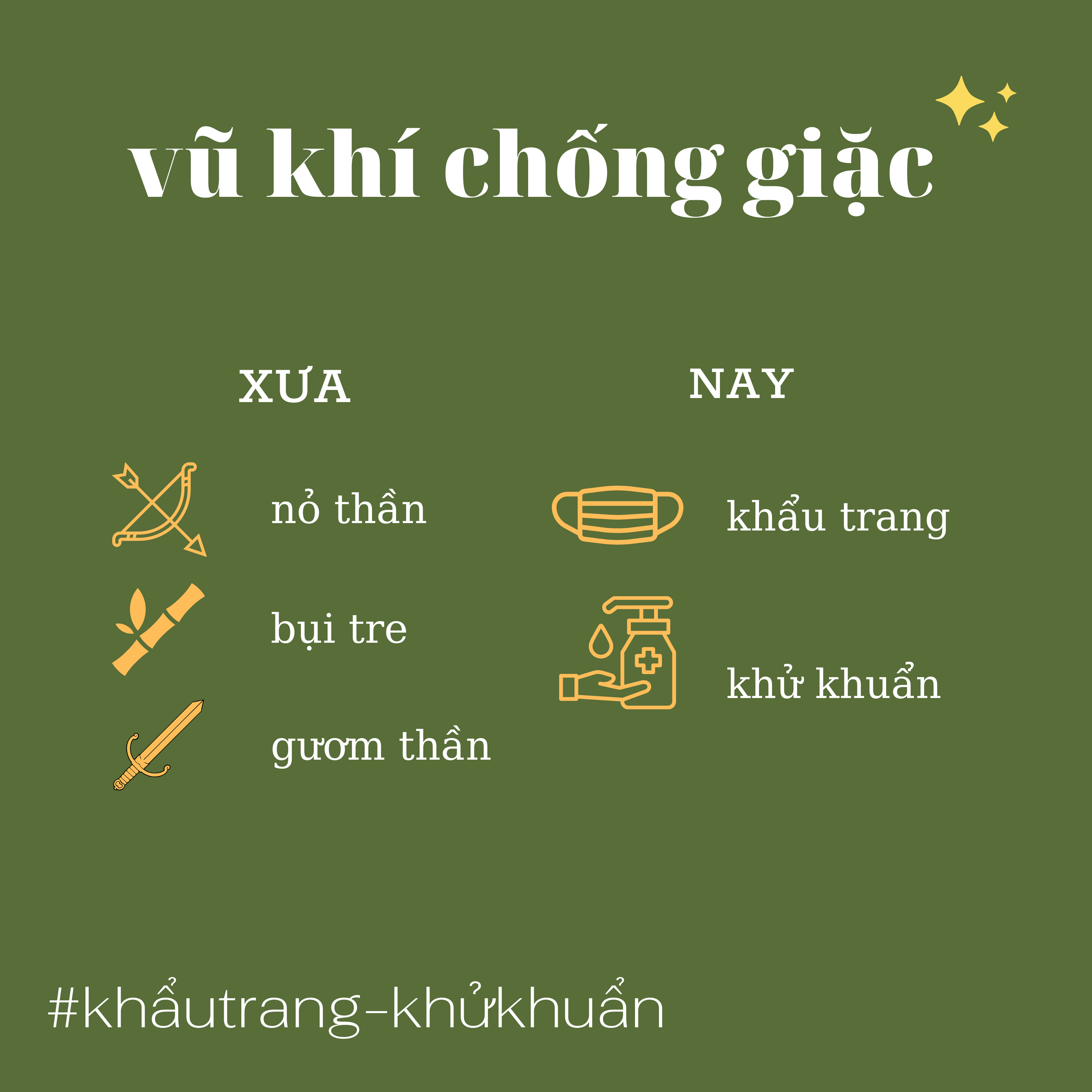 Trải dài theo dòng thời gian, ông cha ta luôn rạng danh với chiến tích thắng giặc bằng những vũ khí thần kỳ nhưng cũng thật gần gũi. Còn thời nay, chúng ta sẽ chiến đấu với COVID bằng khẩu trang, nước khử khuẩn, cũng lợi hại không kém. Ta nhất định sẽ lặp lại chiến thắng như muôn đời.