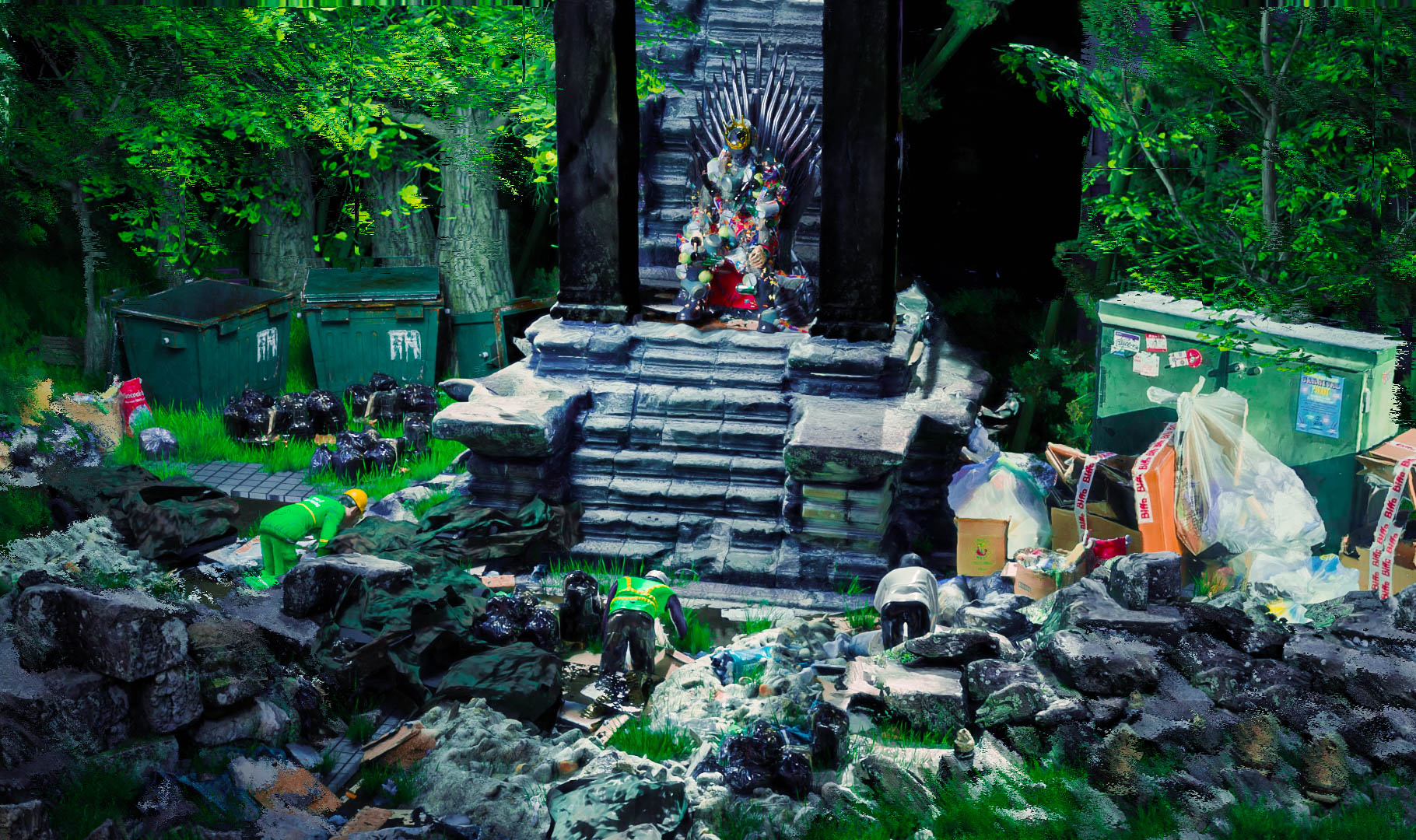 Dưới chân của những ngôi đền, tòa nhà bị bỏ hoang, những đống rác thải là những người lao công vẫn hàng ngày phải dọn dẹp những thứ mà chính con người tạo ra, những người nghèo khổ thì chịu những thứ không mấy sạch sẽ, những người yếu đuối thì phải sống chung với nó, và tất cả đang quỳ gối trước ngai vàng, năn nỉ ông vua dừng lại hành động phá hoại môi trường. Ông ta không biết rằng, những gì ông làm không chỉ hại cho những người xung quanh, mà còn hại cho chính bản thân ông và con cháu ông sau này.