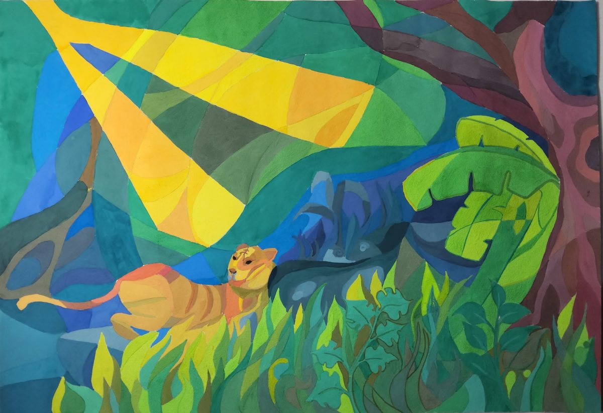 Bức tranh “Về Rừng” của mình lấy ý tưởng từ bức tranh ” Tiger in a Tropical Storm – Surprised!” (Tạm dịch “Hổ trong bão nhiệt đới – ngạc nhiên chưa!”) Của tác giả Henri Rousseau. Bức tranh thay vì miêu tả một khung cảnh bão, mưa và gió đã tạo nên một khung cảnh yên bình với sự hòa sắc của các gam màu nóng và lạnh. Ánh nắng vàng chiếu xuống tạo một cảnh sắc sáng, rọi về phía con hổ và lùm cây. Cây lá đang dần chuyển sắc sáng dần, chào mừng con hổ quay trở về với thế giới của nó. Con hổ lúc này ngoái đầu nhìn lại khung cảnh phía ngoài bức tranh nhằm miêu tả quá khứ khu rừng tùy thuộc vào trí tưởng tượng của người xem.
