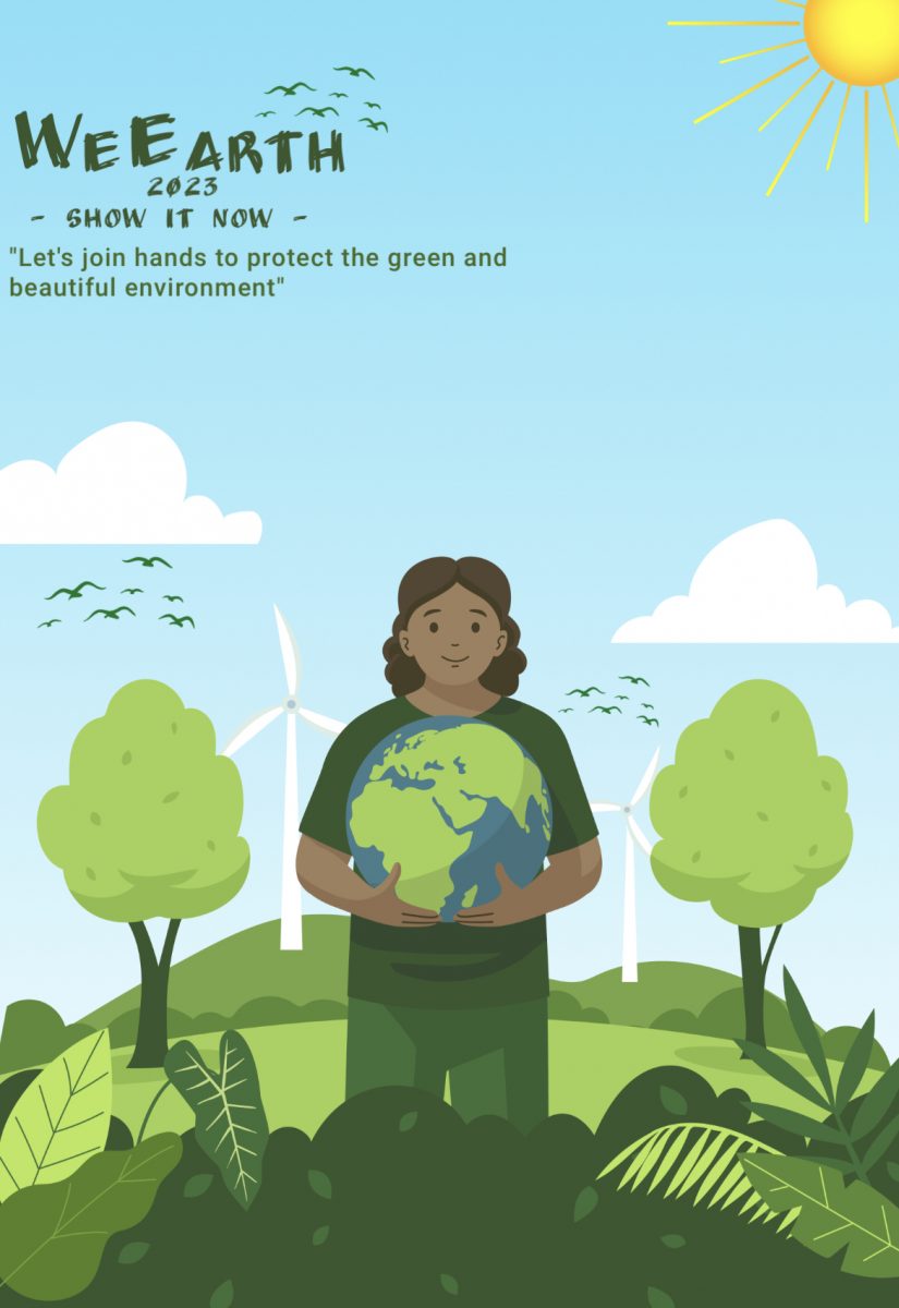 Em lấy ý tưởng từ một người mẹ đang bồng bế đứa con của mình, một người mẹ mang lòng yêu thương con cái hết mức. Với hình anh một người phụ nữ đang bồng bế quả địa cầu như là đang bảo vệ, che chở lấy đứa con tinh thần của mình. Trên hình có một dòng chữ ” Let’s join hands to protect the green and beautiful environment” được dịch nôm na là hãy chung tay bảo vệ môi trường xanh sạch đẹp. Đây là những lời em muốn truyền tải, gửi tới mọi người trong bài thi ạ.