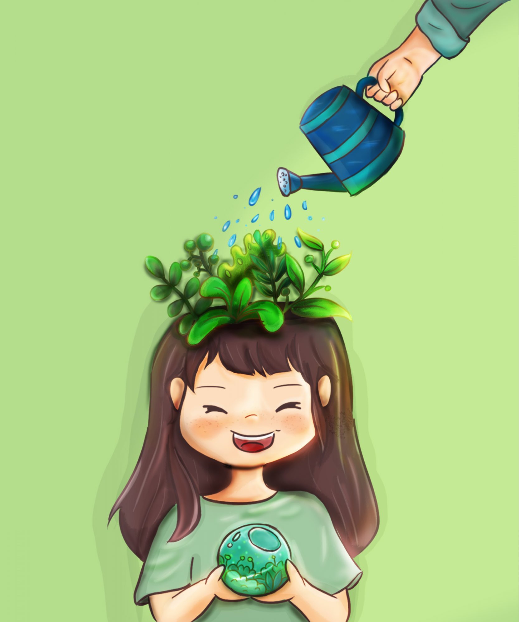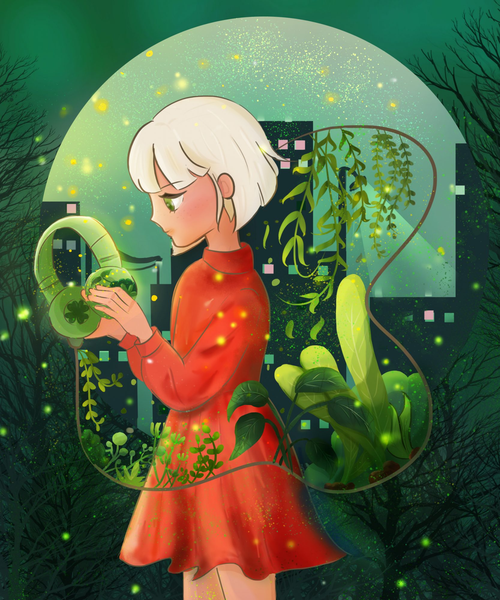 Với bức tranh này, mình muốn mọi người thấy được rằng muốn “sống xanh” thì trước hết tâm hồn, trí não bạn phải “xanh”. Cái “xanh” được thể hiện từ những việc nhỏ nhất, và đặt cả sự chân thành vào đó. Hãy tưởng tượng rằng mỗi con người là một “mầm xanh”, việc của bạn là chăm sóc, nuôi dưỡng cho nó, cũng chính là bạn đang nuôi dưỡng và tưới mát tâm hồn mình đấy! Vì một trái đất xanh, trước hết, ta hãy “làm xanh” chính mình bạn nhé!