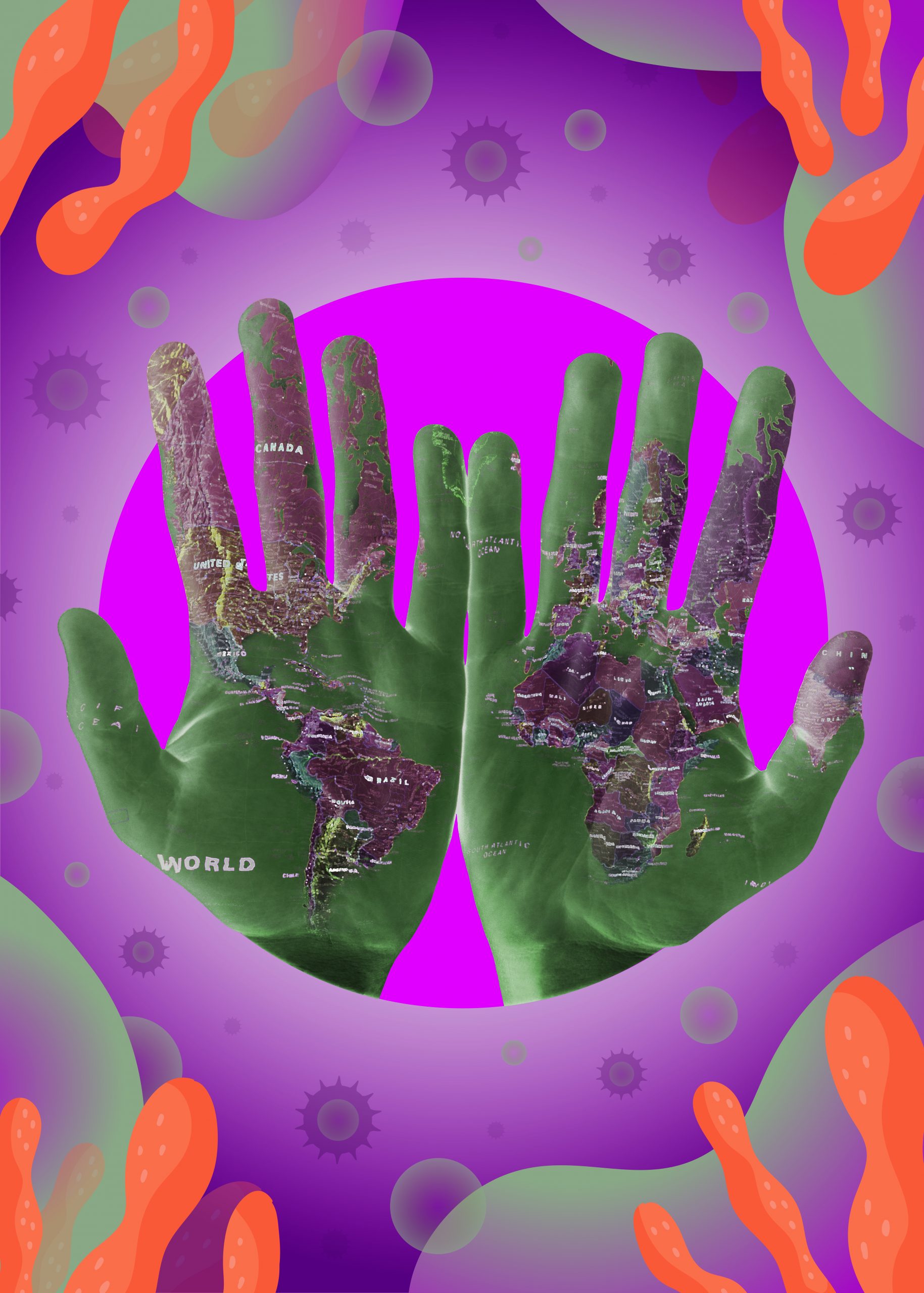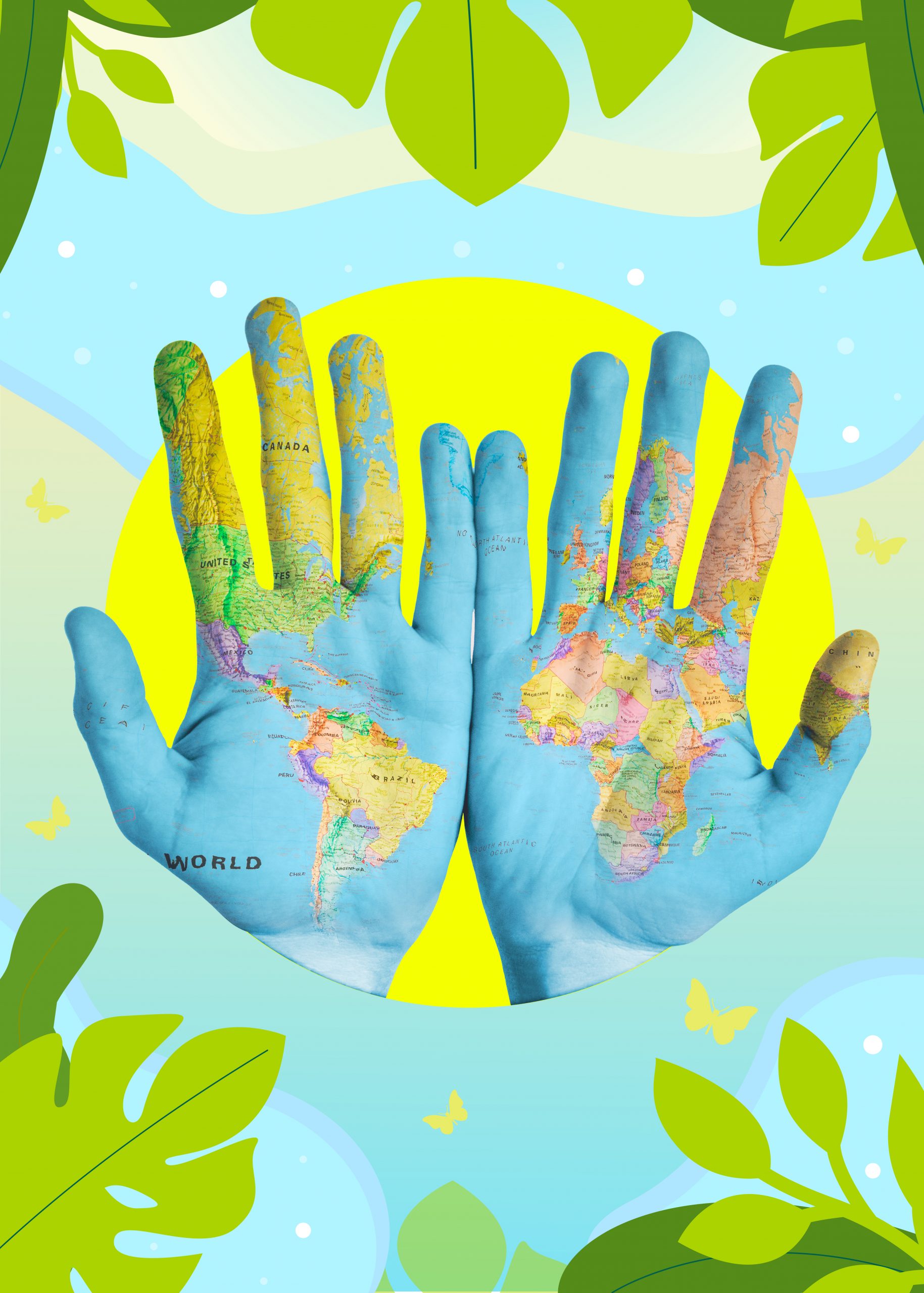 Ở tấm hình đầu tiên, chúng ta thấy được bàn tay chứa cả thế giới, đã hoà làm 1 cùng trái đất, những gì chúng ta làm bằng đôi tay này đều ảnh hưởng trực tiếp cho trái đất và bản thân. Bàn tay đang ở trạng thái khỏe mạnh, qua hình ảnh bản đồ trái đất đầy màu sắc và khung cảnh thiên nhiên tươi đẹp của đất liền, dòng nước, và ánh sáng mặt trời.