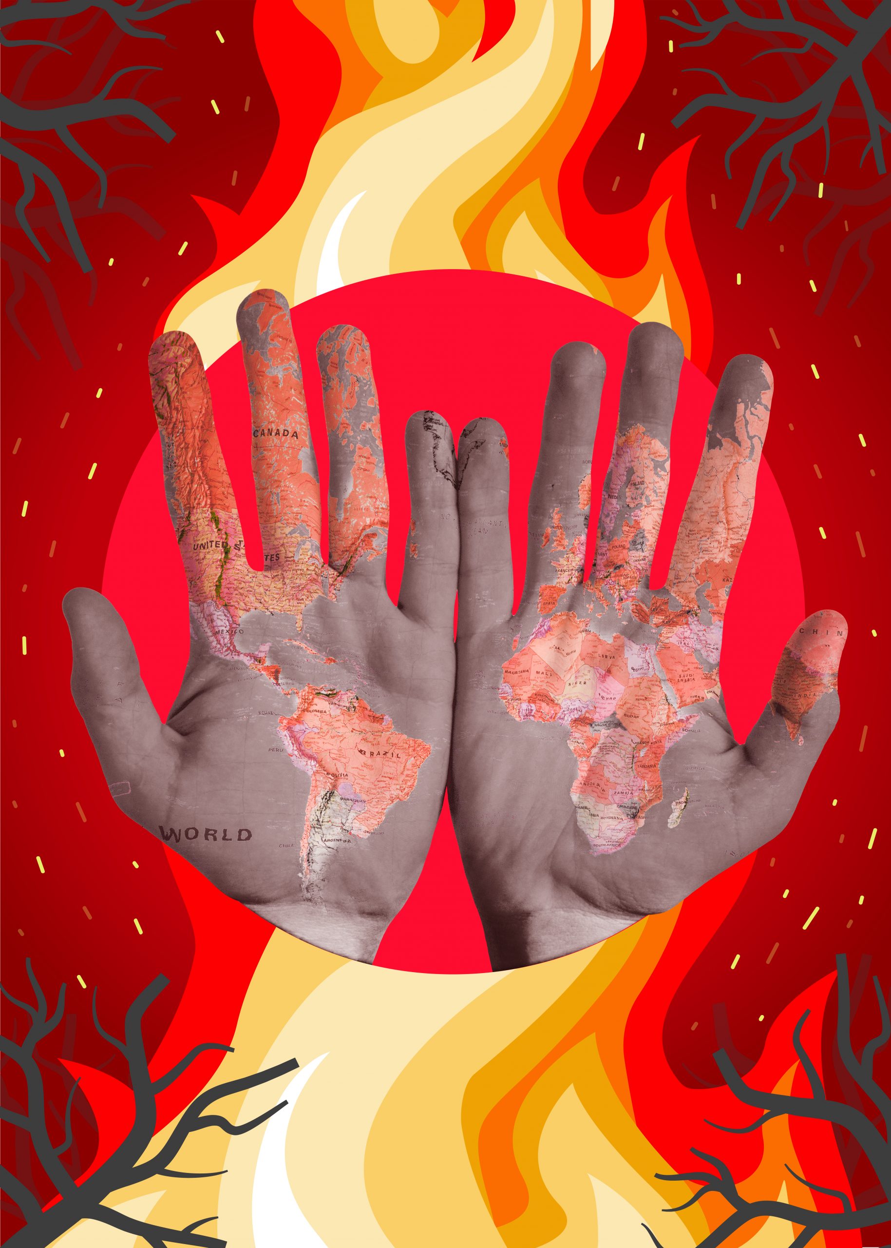 Ở tấm hình thứ 2, chúng ta đang ở trạng thái nóng như lửa đốt, giống như đang trải qua cái nóng của hiện tượng nóng lên toàn cầu, gây ra cháy rừng khiến cây khô héo. Bản đồ trên bàn tay cũng thay đổi, các nước trên bản đồ màu đỏ rực và nước biển màu đen kiểu như đã bốc hết hơi chỉ còn lại mặt đất.