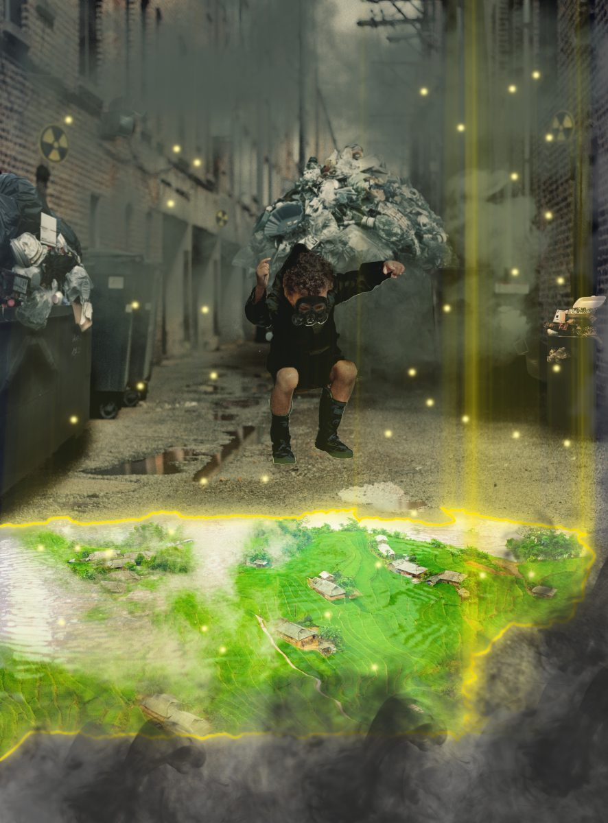 Môi trường càng ngày càng ô nhiễm, đa số nguyên nhân là do con người về việc xả rác bừa bãi, khí thải công nghiệp,…. Qua bài thi, mình muốn đưa ra ý tưởng: ở tương lai, môi trường ô nhiễm đến mức một đứa bé chỉ muốn tìm cách để tới nơi môi trường trong xanh, không khí trong lành, nơi mà không cần mang mặt nạ phòng độc hay áo quần bảo hộ. Nhưng tất cả chỉ là trong tưởng tượng của nó về vũng nước trước mặt. Thông điệp mình muốn nhắn gửi các bạn là: hãy bảo vệ môi trường để tương lai các thế hệ sau này không phải gánh chịu thứ chúng ta gây ra ở hiện tại, và thế hệ sau sẽ nhìn và noi gương hành động chúng ta bây giờ để bảo vệ lấy môi trường. Mình cảm ơn các bạn đã xem bài của mình.