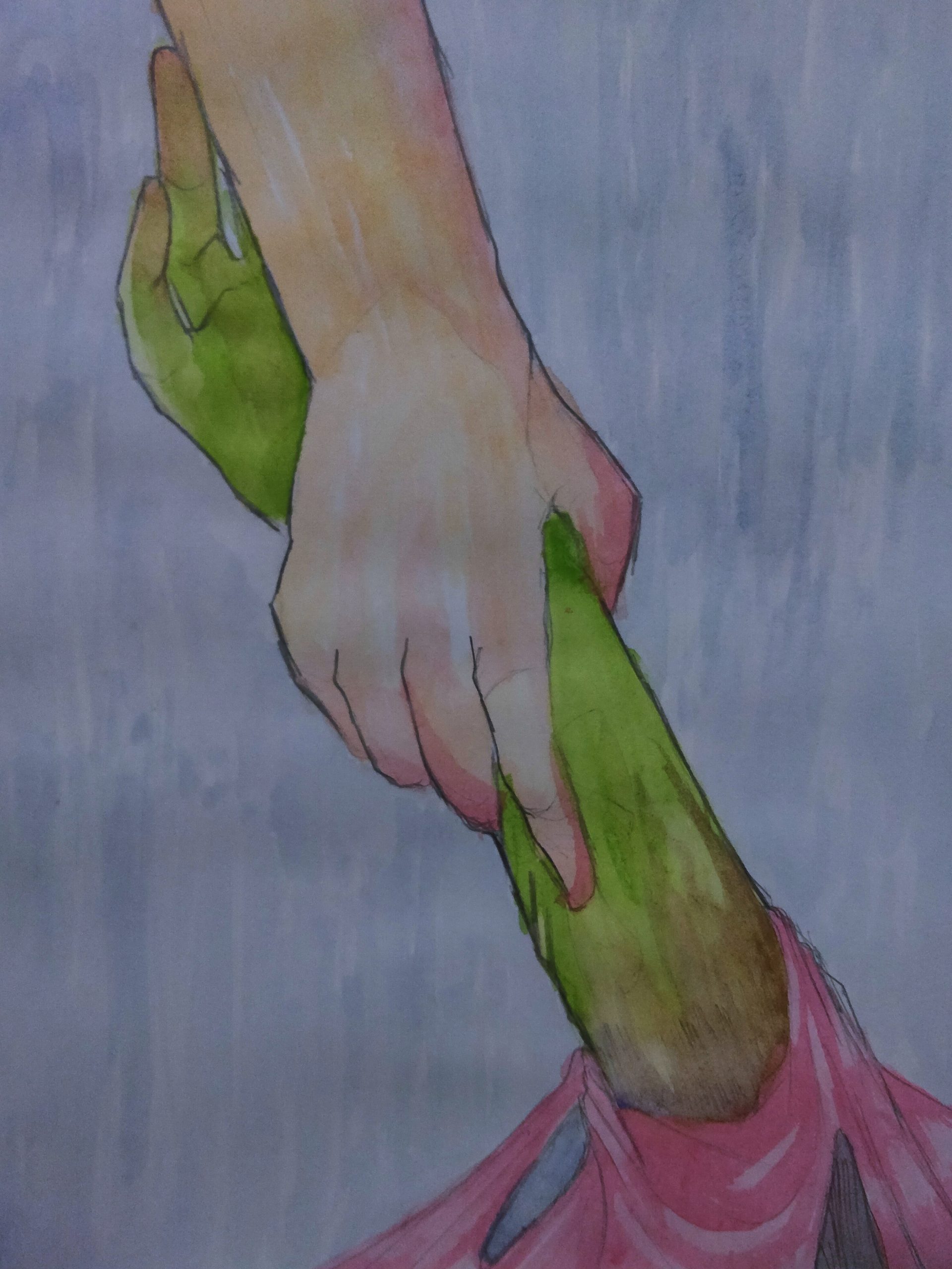 Qua tác phẩm của mình em muốn miêu tả loài người đang cố gắng cứu thiên nhiên khỏi sự lôi kéo của túi nilon và rộng hơn là ô nhiễm môi trường. Cánh tay màu xanh – biểu tượng cho thiên nhiên – đang héo mòn và có dấu hiệu buông lỏng, bỏ cuộc, sẵn sàng bị kéo xuống bởi rác thải nhựa. Nhưng cánh tay màu da vẫn đang giữ lấy nó. Tác phẩm nói lên rằng môi trường đang dần suy thoái nhưng nếu cộng đồng chung tay và nỗ lực thì chúng ta có thể cứu thiên nhiên khỏi sự hủy hoại.