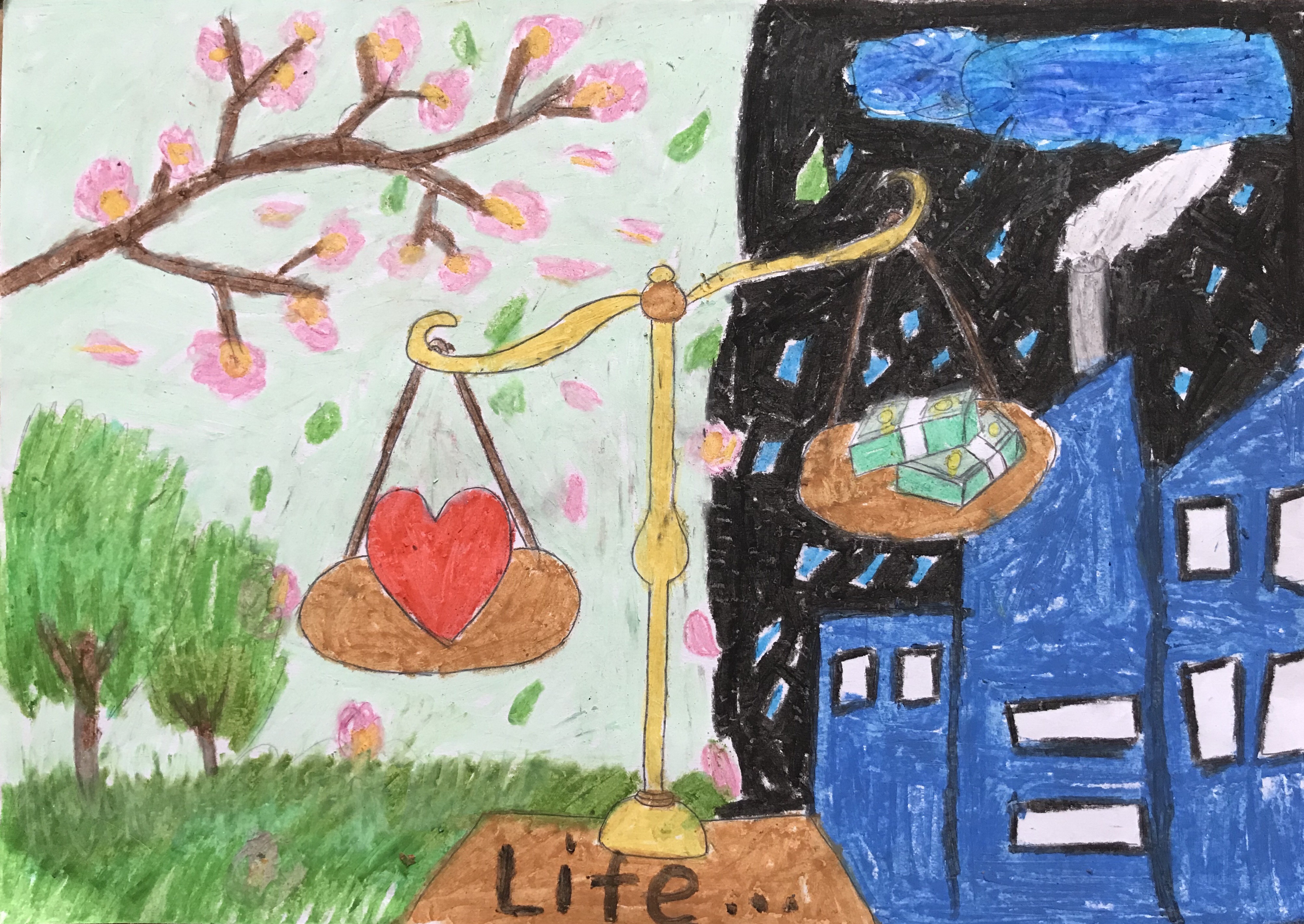 Thông qua bức tranh, mình muốn gửi gắm đến mọi người rằng: Trong cuộc sống hai thứ tiền bạc và tình yêu đều rất quan trọng. Tuy nhiên nếu cuộc sống chỉ có tiền bạc thì chưa chắc ta có thể hạnh phúc, nhưng với tình yêu, chúng ta sẽ thật sự vui vẻ, cuộc đời tràn đầy sắc tươi của nhưng điều đẹp đẽ nhất. Và điểm đặc biệt trong bức tranh là cán cân để đo đếm sức mạnh. Mình vẽ tình yêu nặng hơn tiền bạc để thấy rằng cuộc sống hạnh phúc, tươi sáng cũng nhiều hơn những điều tối tăm, bị che mờ bởi tiền bạc. Qua đó, trong cuộc sống có thể chúng ta không cần phải giàu có nhưng chúng ta có tình yêu thì cuộc sống sẽ luôn tươi đẹp và hạnh phúc