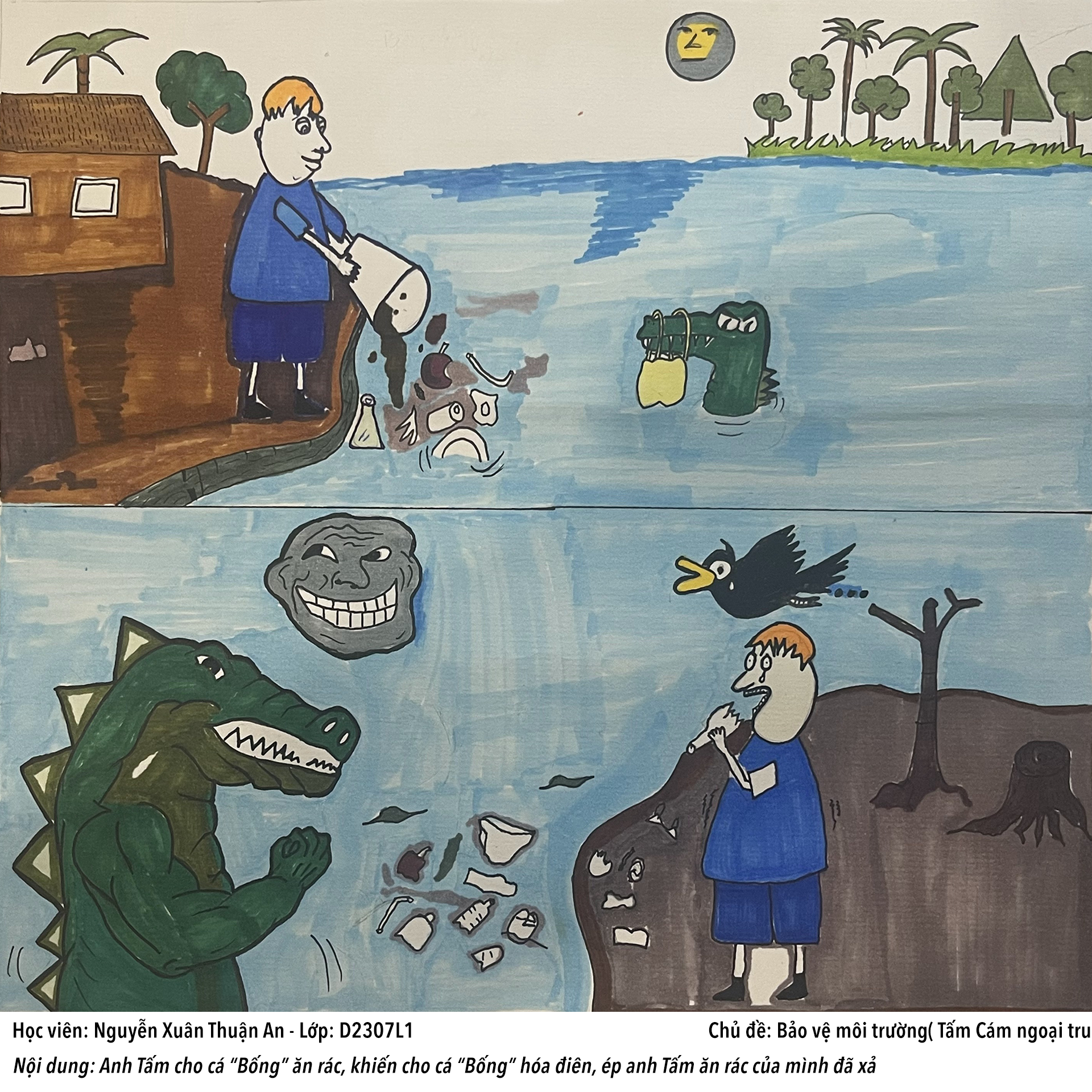 Hình ảnh chú cá sấu mang tên Bống và chàng trai tên Tấm. Hình ảnh anh Tấm đổ rác xuống biển nói lên sự thờ ơ của loài người không ý thức bảo vệ môi trường, khiến cho nhiều động vật phải “xanh cỏ”. Hình ảnh anh Tấm ăn chai lọ, đã thực hiện theo cách nhân hoá loài vật, nói lên những lời phản đối về sự thờ ơ, ở dơ của loài người hiện nay. Và cũng nói lên 1 điều rằng: “Anh cho tôi ăn rác được, thì anh cũng phải ăn được”.