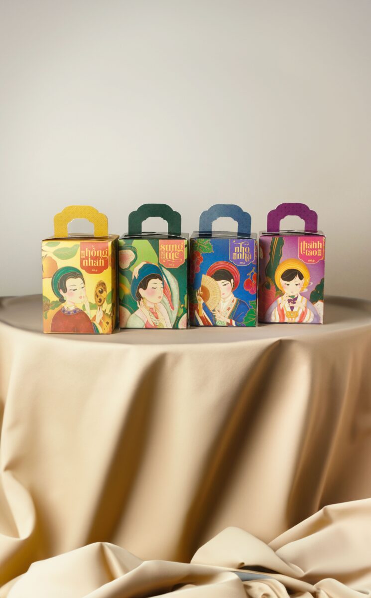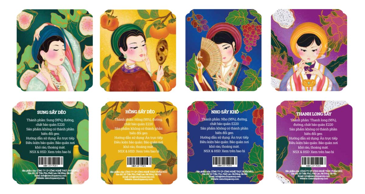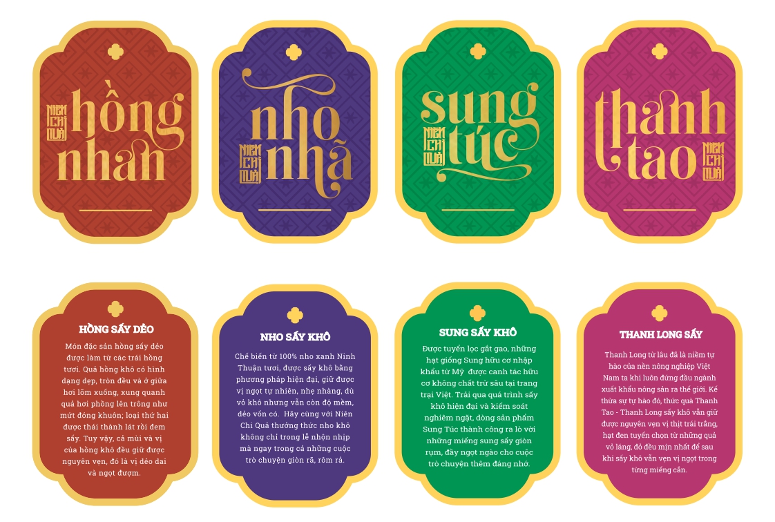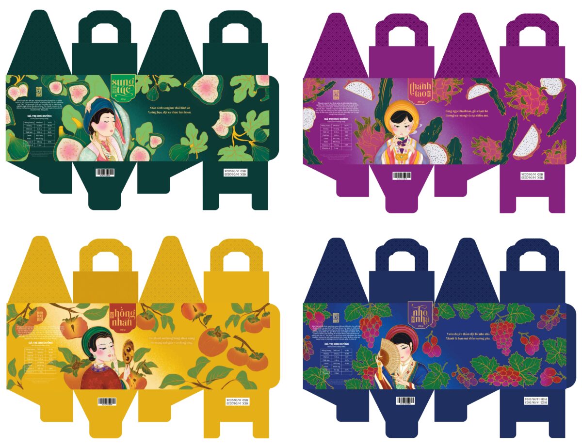 Niên Chi Quả lấy cảm hứng từ tinh thần tri ân đất Việt, nơi kết tinh những giá trị truyền thống và nguồn nguyên liệu tự nhiên trù phú. Thiết kế bao bì hướng đến sự giao thoa giữa vẻ đẹp cổ truyền và ngôn ngữ thị giác đương đại, thể hiện qua màu sắc, họa tiết và hình khối mang âm hưởng văn hoá dân tộc. Họa tiết và màu sắc trong tác phẩm được lấy cảm hứng từ hoa văn và thiết kế trên cổ phục Nhật Bình, nơi chủ đạo là các họa tiết hoa lá và mảng văn cổ được cách điệu để phù hợp với mục đích hình họa hiện đại. Bộ key visual gồm bốn nhân vật đại diện cho bốn mùa trong năm, mỗi nhân vật mang theo một quẻ, một cá tính và một lời chúc riêng biệt – Sung Túc, Thanh Tao, Nho Nhã, Hồng Nhan. Họ là những biểu tượng tươi mới của văn hóa Việt Nam, thể hiện sự đa dạng, tinh tế và sức sống của bốn mùa, cũng như khát vọng gìn giữ và lan tỏa vẻ đẹp truyền thống bằng một diện mạo mới mẻ, hiện đại.