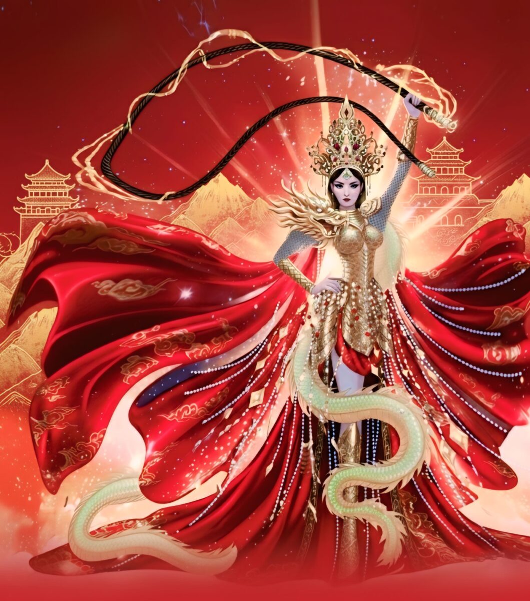 Nữ Long Đế – một tuyệt tác tôn vinh sức mạnh tối cao của người phụ nữ Việt Nam, hun đúc từ hào khí Bà Trưng, Bà Triệu. Trang phục nổi bật với sự kết hợp Đỏ quyền lực và Vàng kim vương giả. Bộ giáp vàng và vương miện lộng lẫy thể hiện vị thế Hoàng Đế uy nghi. Hình tượng Rồng Xanh quấn quanh khẳng định cô ấy là chủ nhân của Long mạch. Chiếc roi uy quyền thay cho quyền trượng, là biểu tượng của ý chí sắt đá, quyết đoán như tinh thần “cưỡi cơn gió mạnh” của nữ anh hùng dân tộc. Nữ Long Đế chính là thông điệp hùng hồn: Phụ nữ Việt Nam là sức mạnh, là linh hồn của dân tộc, và là người nắm giữ vận mệnh đất nước.