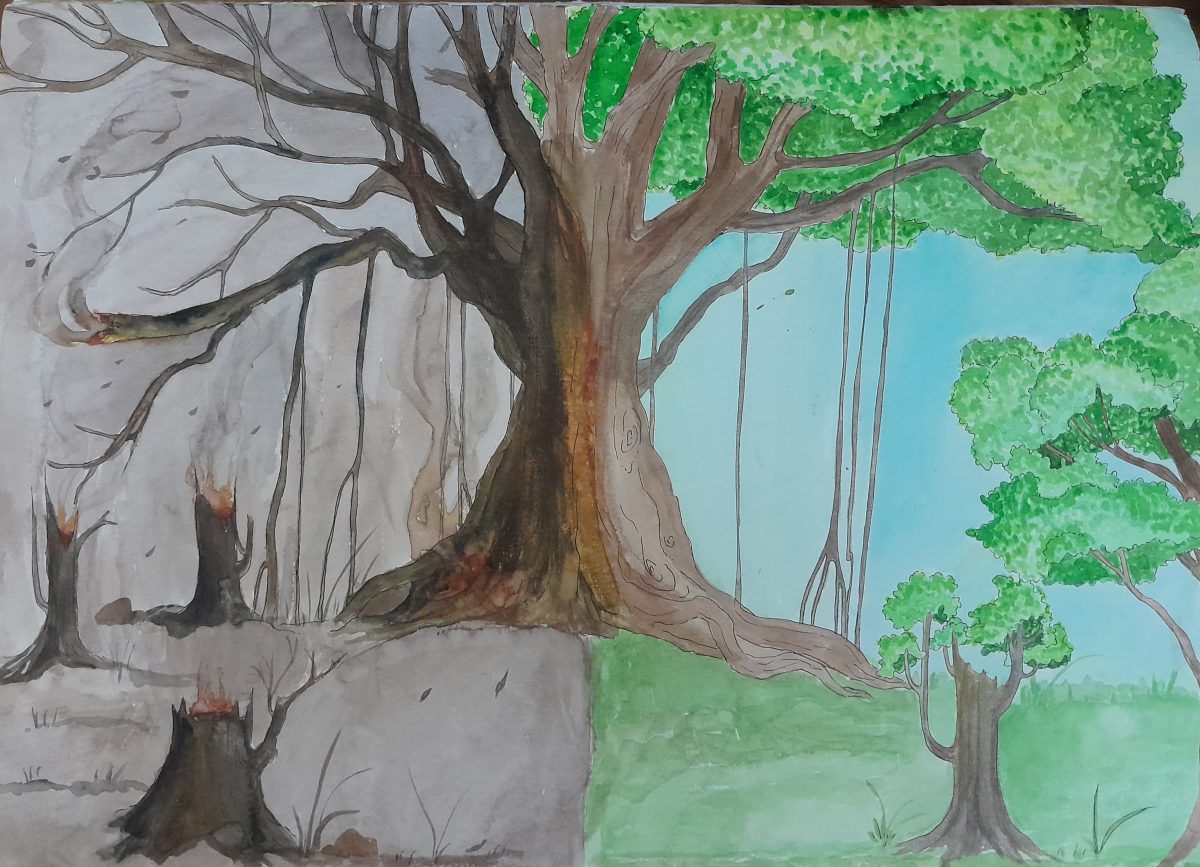 Bài vẽ của mình lấy đề tài cháy rừng do ô nhiễm không khí sức ảnh hưởng của sự nóng lên toàn cầu là nguy cơ gây ảnh hưởng đến sức khỏe và ảnh hưởng tới thiên nhiên môi trường sống xung quanh chúng ta.