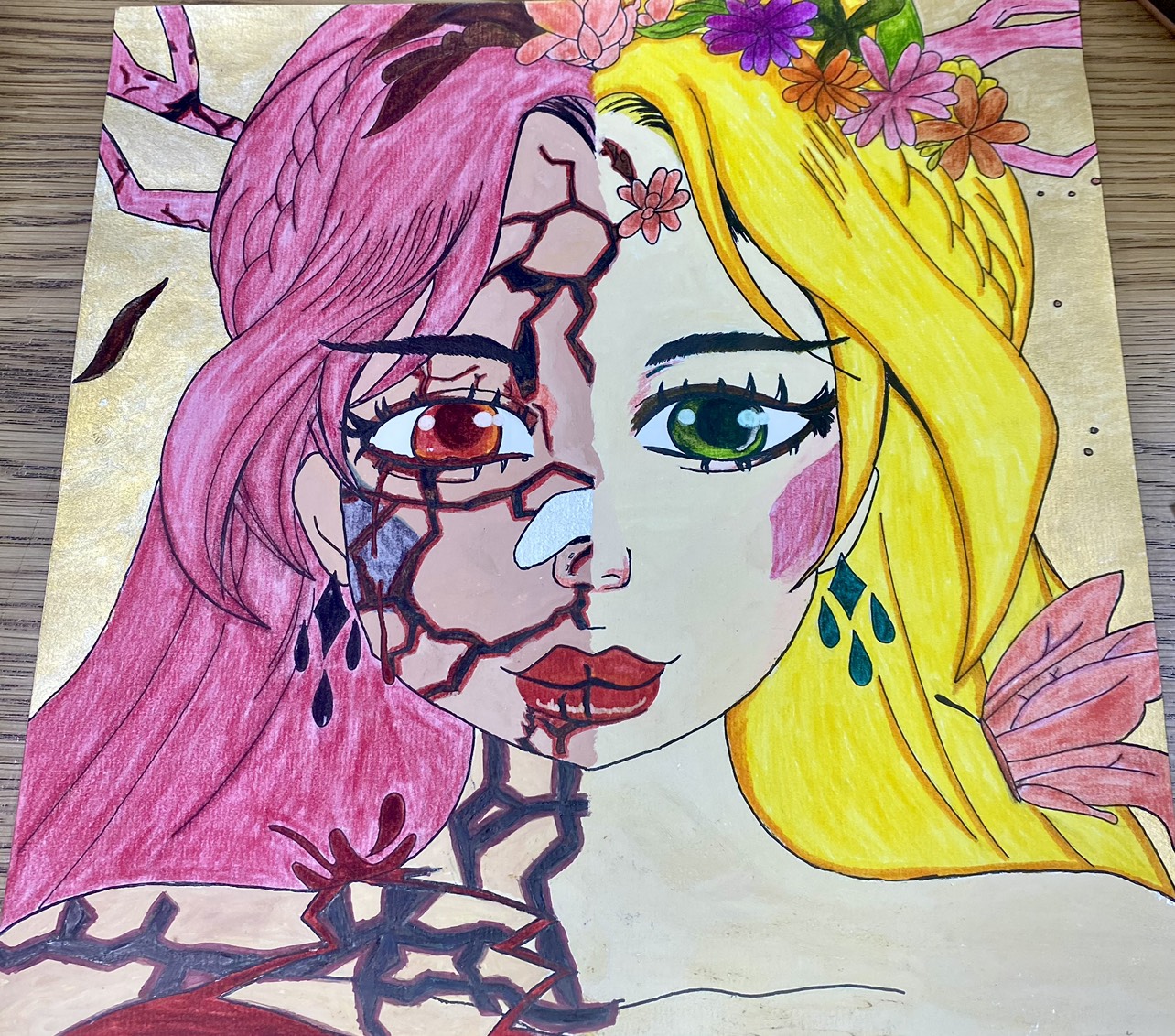 Bức tranh vẽ về nữ thần thiên nhiên với nửa bên phải là thể hiện sự sinh trưởng, sự tươi tốt, bướm bay hoa nở. Đó là một cô gái có gương mặt tươi trẻ và hồng hào, nhưng nửa mặt bên trái là những vết thương ngày càng lan ra, từng vết thương là những lần thiên nhiên bị tổn thương bởi con người. Vết nứt bị rỉ máu, cỏ cây hoa lá héo khô, muôn thú không sống nổi và cô khóc, đau đớn cho một hình hài không còn nguyên vẹn như lúc đầu.