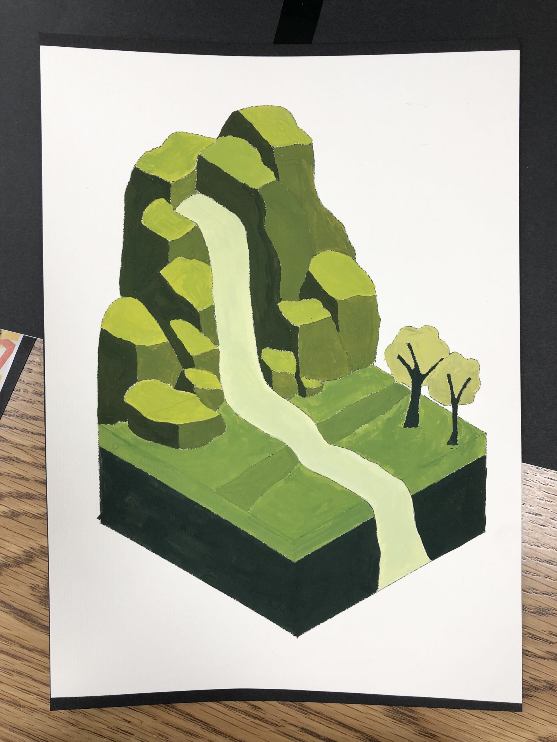 Bài vẽ được vẽ theo thể loại Isometric Art về chủ đề môi trường. Được lấy cảm hứng từ hình ảnh thác nước và vách đá . Bài vẽ sử dụng tông màu xanh đơn sắc tạo nên một khung cảnh thiên nhiên xanh tươi, yên bình. Tác phẩm nhấn mạnh nét xanh và đẹp của thiên nhiên và môi trường. Hãy cùng tạo và gìn giữ môi trường xanh sạch đẹp để mang lại cuộc sống xanh cho trái đất.