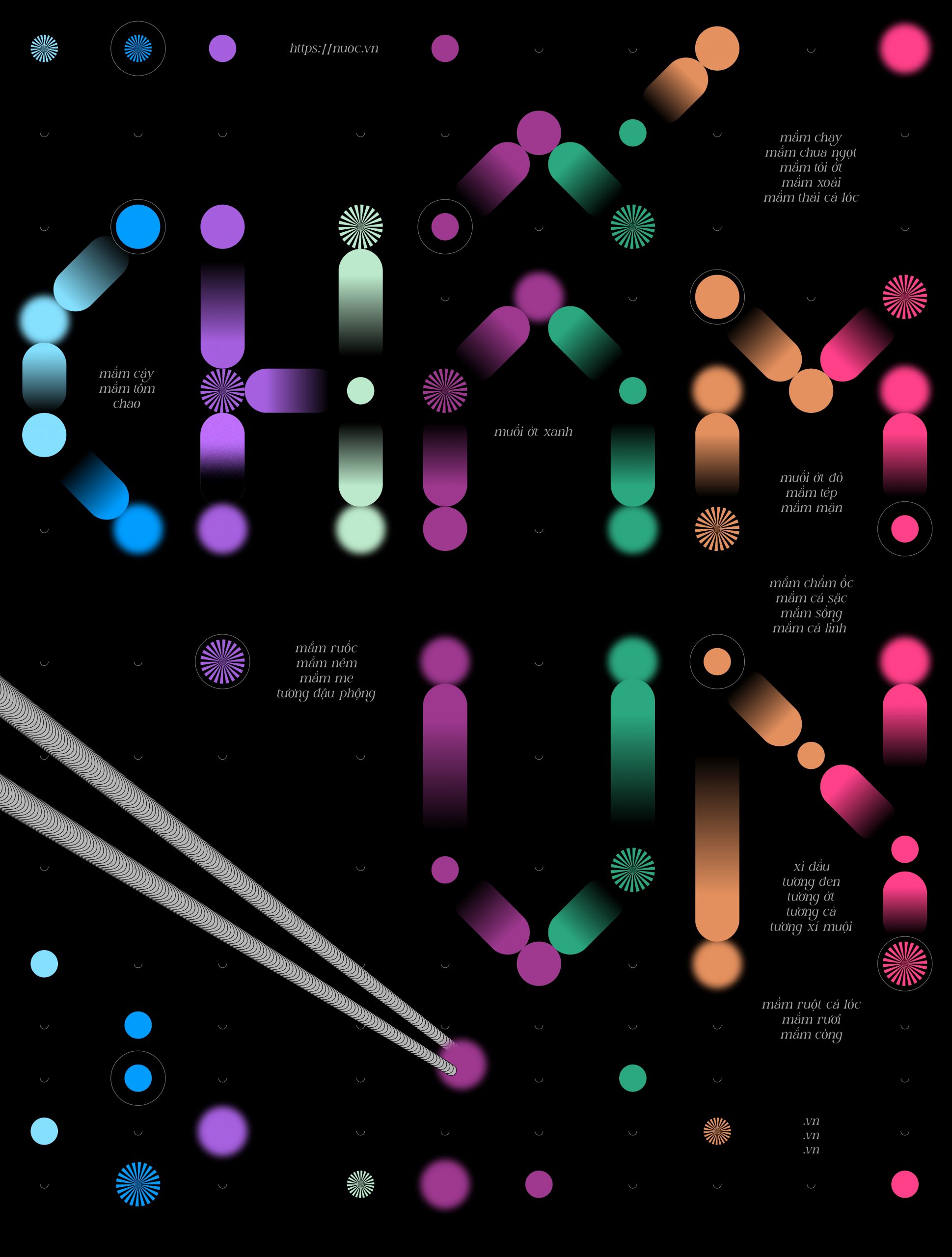 Tác phẩm muốn giới thiệu sự đa dạng và đa màu sắc của các loại nước chấm Việt Nam với hình thức đồ hoạ cách điệu. Nhấn mạnh yếu tố “Chấm” bằng các chấm. Mỗi chấm là một chén chấm. Hành động chấm của đôi đũa trong bàn ăn. Và “chấm vn” để truy cập vào bữa tiệc bùng Hương – Vị – Sắc.