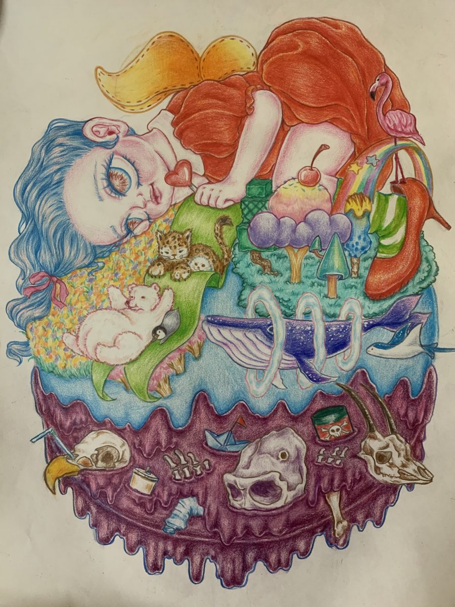Trước đây, khi chứng kiến những người trẻ được lựa chọn để giáo dục và tham gia bảo vệ môi trường, cá nhân tôi đơn thuần nghĩ rằng lý do đằng sau việc đó chỉ là những người trẻ có sức khỏe, nhiệt huyết và tư duy minh mẫn để gánh vác những công việc mà người lớn tuổi hơn cho là rỗi hơi. Sau này, khi có cơ hội lắng nghe những chia sẻ của tiến sĩ Jane Goodall về vấn nạn ô nhiễm môi trường cũng như các tác động của con người dẫn đến sự suy giảm môi trường sống của động vật, có một trích dẫn từ bà khiến tôi cảm động và giữ mãi trong lòng đến tận bây giờ. Đó là về những người trẻ, giữa một thế giới hỗn loạn, tham lam vô cùng, được lựa chọn để thay đổi vận mệnh của tự nhiên, bởi họ vẫn chưa bị cuốn đi bởi lòng tham hay khát vọng tiền bạc. Họ không chỉ nắm giữ tương lai, ở họ còn vẹn nguyên những suy nghĩ, những rung cảm đơn thuần, trong sáng dành cho thế giới ngoài kia và điều đó khiến cho việc truyền tải tình yêu môi trường tới họ trở nên dễ dàng, tự nhiên, thấm nhuần hơn là những người lớn giỏi tính toán. Ở bức tranh tôi vẽ, hình ảnh cô bé váy đỏ, tượng trưng cho thế hệ người trẻ, tôi đã muốn khắc họa tất cả dáng vẻ trong sáng, trẻ con, vô tư nhất của bé với tóc ruy băng, tay cầm kẹo mút, đeo cánh tiên, xỏ giày cao gót của mẹ, đang trong độ tuổi đầy tò mò, nghịch ngợm. Tư thế bé chúc đầu xuống áp tai vào mặt đất vừa thể hiện ham muốn khám phá, đi tìm câu trả lời vừa giống như bé đang lắng nghe mặt đất, lắng nghe tự nhiên với sự cảm thông và tình yêu ngây thơ, có phần hơi ngốc nghếch. Kích thước của cô bé phản ánh tầm ảnh hưởng của em đến môi trường tự nhiên, dưới sự lắng nghe và cái chạm ấm áp của em, thế giới ấy trải đầy màu sắc và căng tràn sức sống, tất cả sự vật đều đang hiện lên trong trạng thái vui tươi, năng động nhất. Ngược lại, nửa dưới chưa được cô bé chạm tới lại ngập ngụa chết chóc, rác thải và sự đen tối bao trùm như chính thế giới khi vắng bóng những người trẻ. Tôi hi vọng rằng, sau thông điệp mà tôi muốn gửi gắm qua bức tranh này, chúng ta có thể trân trọng, tập trung và đầu tư hơn nữa cho vai trò của những người trẻ trong việc giải cứu thế giới, thay đổi tương lai loài người cũng như mọi sinh vật sống trước tình trạng ô nhiễm môi trường ngày càng trầm trọng đang diễn ra.