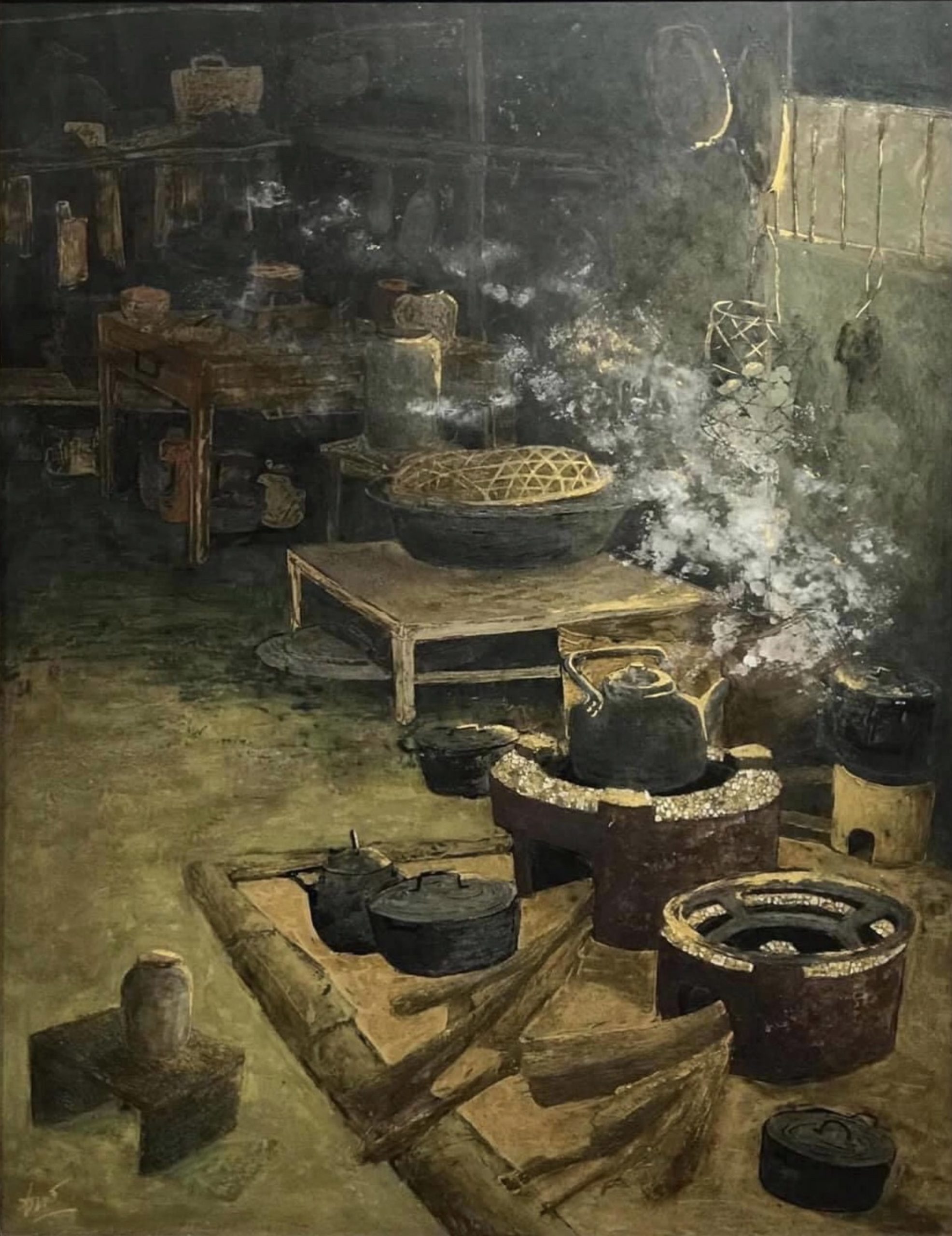 Khi về Hà Nội, cùng với những kí hoạ tôi đã vẽ được, có một bức vẽ bếp, đó là một buổi chiều mưa vùng núi, khoảng 4h chiều, ánh đèn mập mờ, tôi xin trú mưa tại nhà một người dân và phát hiện ra căn bếp nhờ làn khói bay nghi ngút qua cửa sổ. Một chiều mưa lạnh. Tôi ngồi cạnh chiếc bếp lò đã gần tắt, sưởi ấm. Hít từng đợt khói từ siêu nước vừa sôi, mùi khói, mùi nước mưa, hơi ấm từ căn bếp với ánh sáng lờ mờ, ánh lên một vài tia sáng từ bên ngoài, tôi lấy giấy bút và vẽ lại khung cảnh ấy, một niềm hạnh phúc nhẹ bởi tôi được sống trọn khoảnh khắc trời chiều nơi phố núi, nghe từng hạt mưa rơi, chờ từng tia nắng chiếu lại vào căn bếp quê, sự yên lặng, tĩnh mịch, chỉ tôi với bếp, cặm cụi vẽ, khói nghi ngút bay. Tôi muốn truyền tải những ấn tượng đó thông qua một bức tranh về “ Bếp của người Nùng”. Từ kí hoạ thành một bức tranh sơn mài.