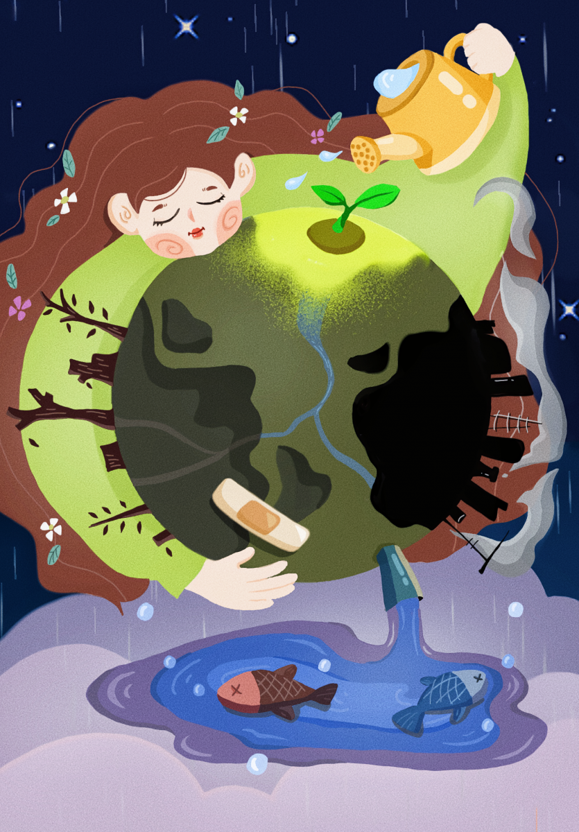 Trái Đất – Ngôi nhà chung của chúng ta đang dần mất đi màu xanh vốn có bởi sự ô nhiễm nặng nề. Mình lấy ý tưởng từ chính thực trạng của Trái Đất hiện nay: Đốt rừng, khai thác tài nguyên rừng một cách bừa bãi, ô nhiễm không khí và ô nhiễm nguồn nước. Trái Đất đang gần tiến gần tới “điểm giới hạn” của nguy hiểm. Chúng ta là nạn nhân của sự ô nhiễm nhưng chính chúng ta cũng là nguyên do lớn nhất gây nên sự ô nhiễm này. “Một mầm cây có thể mang lại cả khu rừng” mình muốn gửi gắm thông điệp vào bức tranh: chỉ cần mỗi người trong chúng ta trồng một cây xanh đã góp phần giúp Trái Đất xanh trở lại. Chúng ta hãy cùng chung tay có ý thức và trách nhiệm bảo vệ Trái Đất, bởi vì bảo vệ Trái Đất cũng là bảo vệ chính chúng ta.