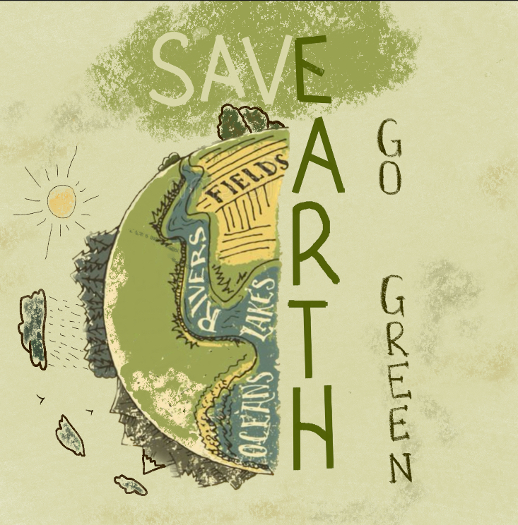 Tác phẩm của em là trái đất mà em mong muốn trong tương lai: xanh – sạch – đẹp và dòng chữ “Save Earth” làm nổi bật bên cạnh như lời kêu gọi hãy cứu Trái Đất.