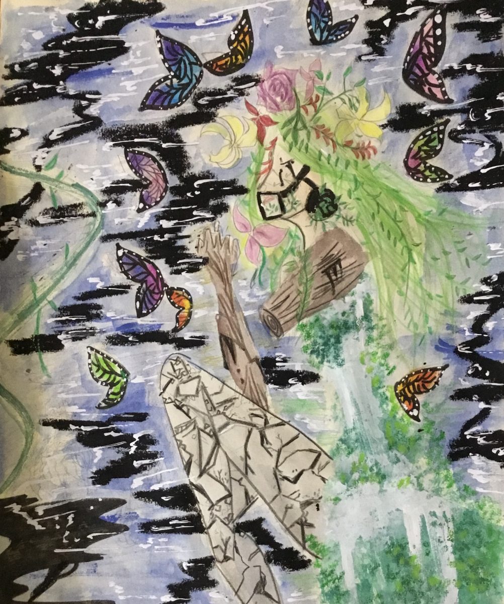 Trong tranh của mình thiên nhiên được người hoá và trên chính cơ thể của cô ấy đầy những dấu tích của tàn phá gây ra bởi con người hai bàn tay của cô là gỗ bị cắt cụt, đầy vết chém của rìu, đôi chân tượng trưng cho đất bị xói mòn và khô hạn nứt nẻ, mặc dù trong tình trạng đang chết dần cô vẫn gắng sức bảo vệ chồi non nhỏ đang phát triển giữa biển hồ bị ô nhiễm bởi dầu trong nước, thậm chí còn biến máu và nước mắt của cô thành dầu và ở đây bầu không khí ô nhiễm tới mức cô phải dùng mặt nạ phòng độc và dùng chính bản thân (y lá bên trong mặt nạ) để cung cấp dưỡng khí cho mình.