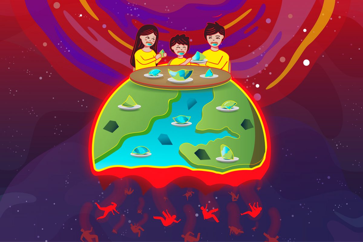 Khi nhìn vào thiết kế, mọi người sẽ thấy 1 gia đình gồm cha mẹ và con đều mặt trang phục vàng tươi đang ăn uống vui vẻ hạnh phúc. Gia đình đang ăn trái đất và trái đất chỉ còn lại phân nửa, sau lưng gia đình là một vòng xoáy màu sắc đầy hiểm nguy, phía dưới là những người đã mất đi vị trí đất của mình và rơi vào vũ trụ vô định.