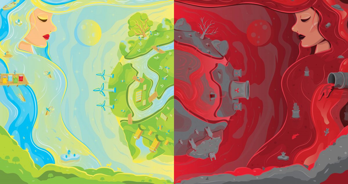 Người mẹ với mái tóc là 1 dòng nước đã bị ô nhiễm nặng nề đầy rác thải, trên dòng sông là tàu chở rác thải, thùng chất thải nguy hiểm và ngọn núi đầy rác.