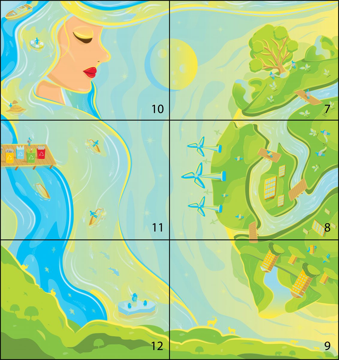 Sử dụng năng lượng xanh có sẵn từ thiên nhiên như gió và ánh sáng mặt trời, có thể thay thế nhiên liệu hóa thạch trong tất cả các lĩnh vực như điện, nước… Trong tranh là hình ảnh các tuabin gió và con người đang lắp đặt các tấm pin mặt trời.